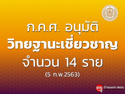 เลขาธิการก.ค.ศ. เปิดเผยว่าในการประชุม อ.ก.ค.ศ. วิสามัญเกี่ยวกับวิทยฐานะข้าราชการครูและบุคลากรทางการศึกษา ครั้งที่ 2/256 3 เมื่อวันพุธที่ 5 กุมภาพันธ์ 2563 ได้มีมติอนุมัติให้ข้าราชการครูและบุคลากรทางการศึกษามีและเลื่อนเป็นวิทยฐานะเชี่ยวชาญ จำนวน 14 ราย ได้แก่วิทยฐานะครูเชี่ยวชาญ จำนวน 4 ราย วิทยฐานะผู้อำนวยการเชี่ยวชาญ จำนวน 1 ราย วิทยฐานะผู้อำนวยการสำนักงาน กศน. จังหวัดเชี่ยวชาญ จำนวน 3 ราย และวิทยฐานะผู้อำนวยการสำนักงานเขตพื้นที่การศึกษาเชี่ยวชาญ จำนวน 6 ราย ดังนี้
