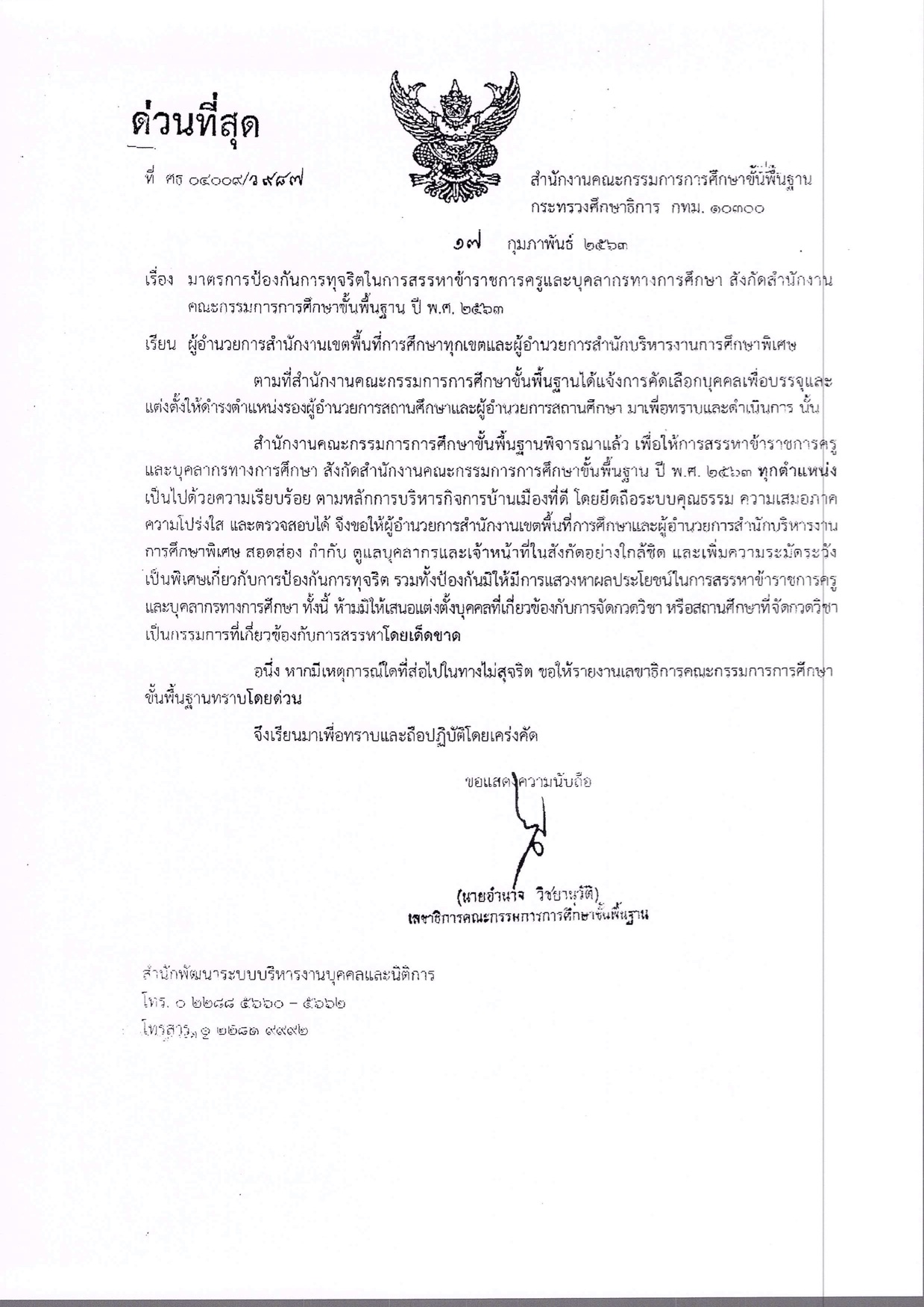 ด่วนที่สุด ที่ ศธ 04009/ว 987 เรื่อง มาตรการป้องกันการทุจริตในการสรรหาข้าราชการครูและบุคลากรทางการศึกษา สังกัด สพฐ. ปี พ.ศ. 2563
