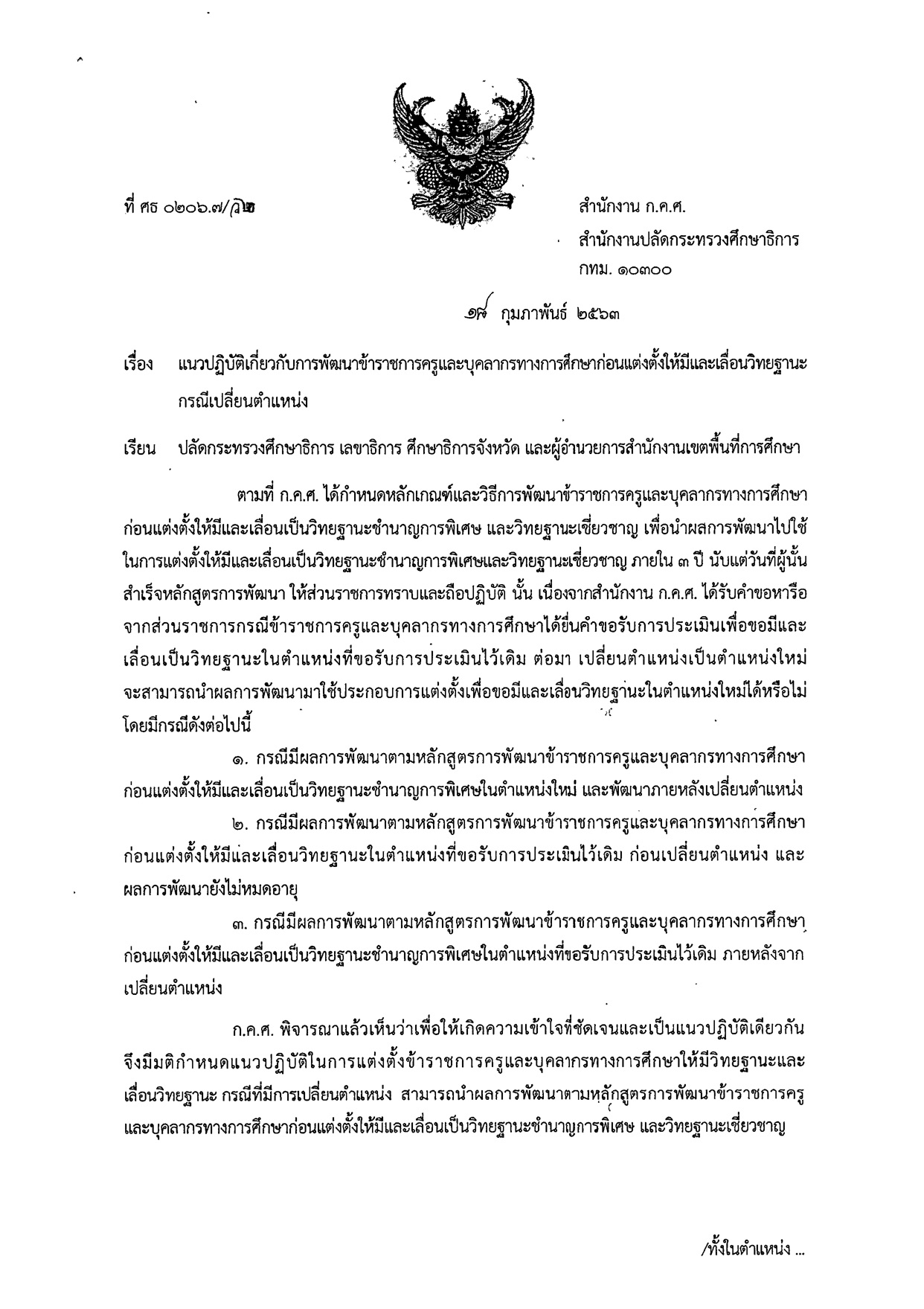 ว 2/2563 แนวปฏิบัติเกี่ยวกับการพัฒนาข้าราชการครูและบุคลากรทางการศึกษาก่อนแต่งตั้งให้มีและเลื่อนวิทยฐานะ กรณีเปลี่ยนตำแหน่ง