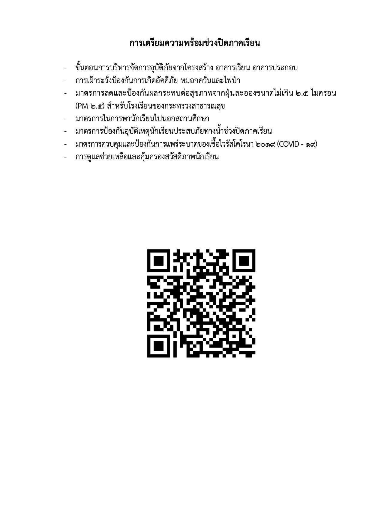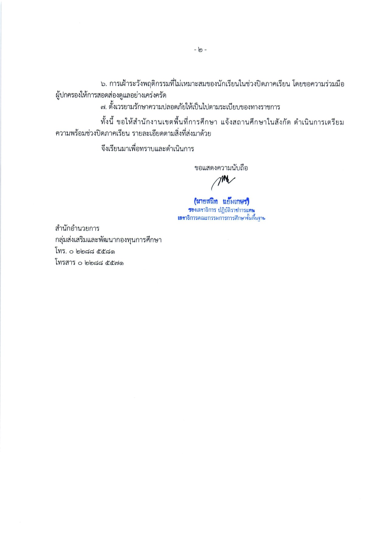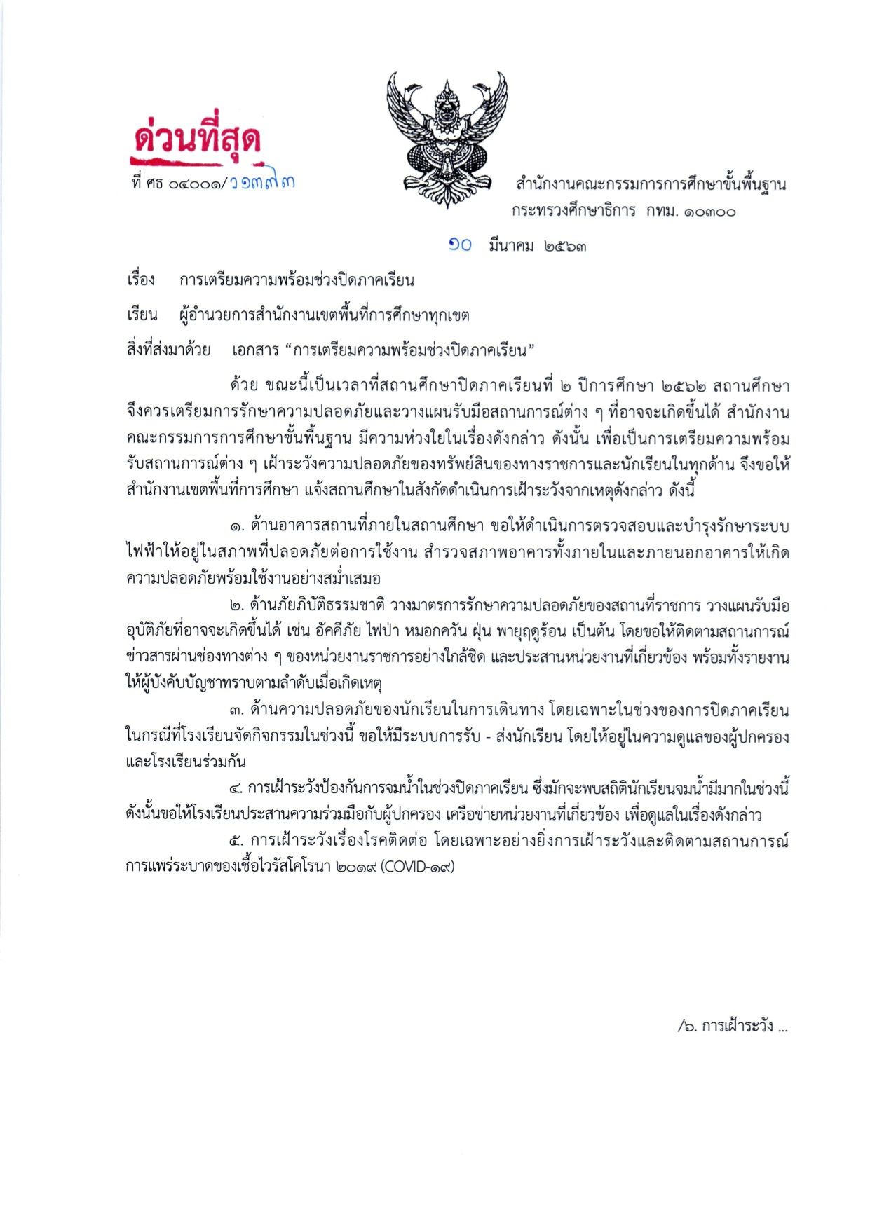 สำนักงานคณะกรรมการการศึกษาขั้นพื้นฐาน มีหนังสือ ที่ ศธ 04001/ว1373 แจ้ง เรื่อง การเตรียมความพร้อมช่วงปิดภาคเรียน ให้ปฏิบัติ ดังนี้