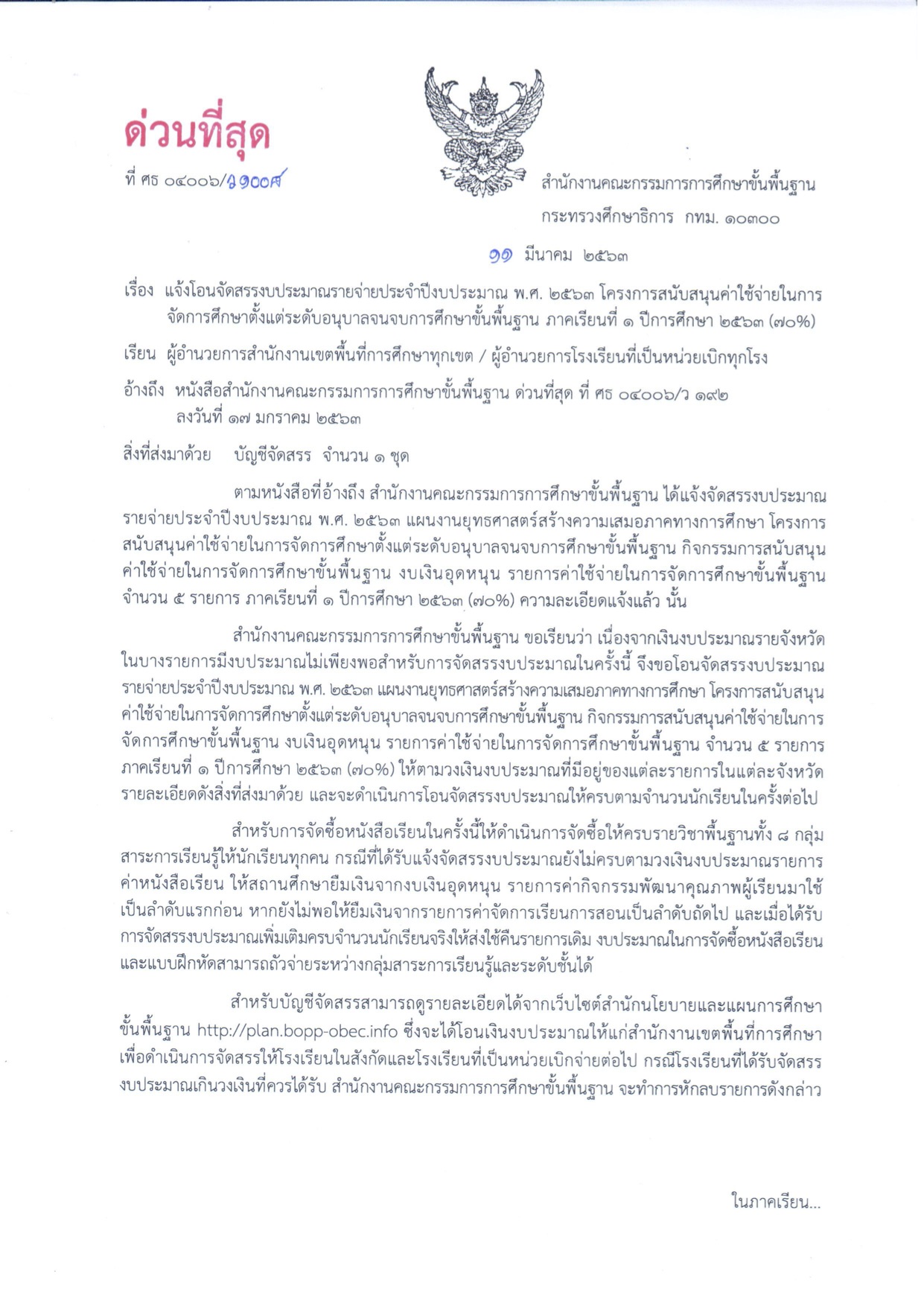 1. หนังสือแจ้ง สพท. 2. บัญชีจัดสรร ร.ร.หน่วยเบิก 3. สรุปจัดสรรราย สพท 4. บัญชีจัดสรรรายโรง 5. ร.ร.ไม่ได้รับจัดสรร