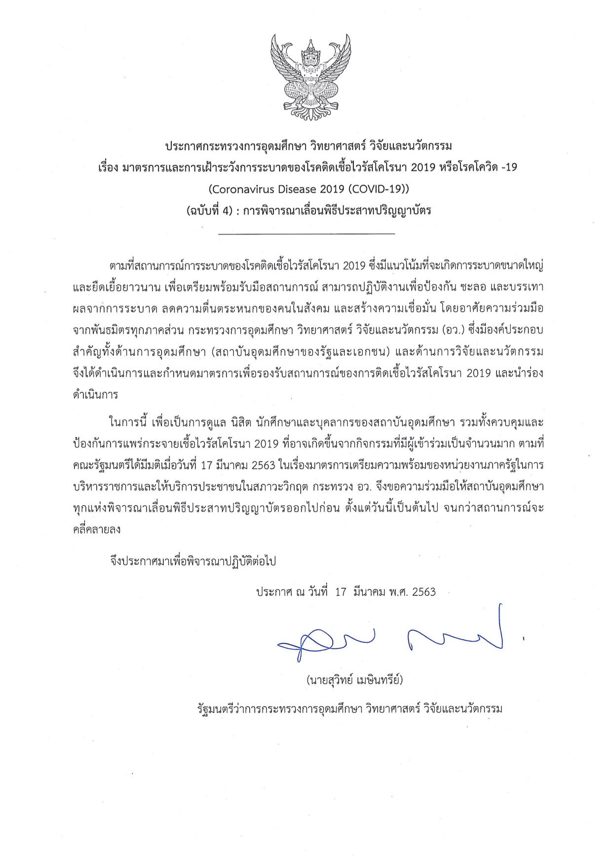 เมื่อวันที่ 17 มี.ค. กระทรวงการอุดมศึกษาวิทยาศาสตร์ วิจัยและนวัตกรรม (อว.) ได้ออกประกาศเรื่องการพิจารณาเลื่อนพิธีประสาทปริญญาบัตร ระบุว่า ตามที่สถานการณ์การระบาดของโรคติดเชื้อไวรัสโคโรนา 2019 ซึ่งมีแนวโน้มที่จะเกิดการระบาดขนาดใหญ่และยืดเยื้อยาวนานเพื่อเตรียมพร้อมรับมือสถานการณ์สามารถปฏิบัติงานเพื่อป้องกันซะลอและบรรเทาผลจากการระบาดลดความตื่นตระหนกของคนในสังคมและสร้างความเชื่อมั่นโดยอาศัยความร่วมมือจากพันธมิตรทุกภาคส่วนกระทรวงการอุดมศึกษาวิทยาศาสตร์วิจัยและนวัตกรรม (อว.) ซึ่งมีองค์ประกอบสำคัญทั้งด้านการอุดมศึกษา (สถาบันอุดมศึกษาของรัฐและเอกชน) และด้านการวิจัยและนวัตกรรมจึงได้ดำเนินการและกำหนดมาตรการเพื่อรองรับสถานการณ์ของการติดเชื้อไวรัสโคโรนา 2019 และนำร่องดำเนินการ