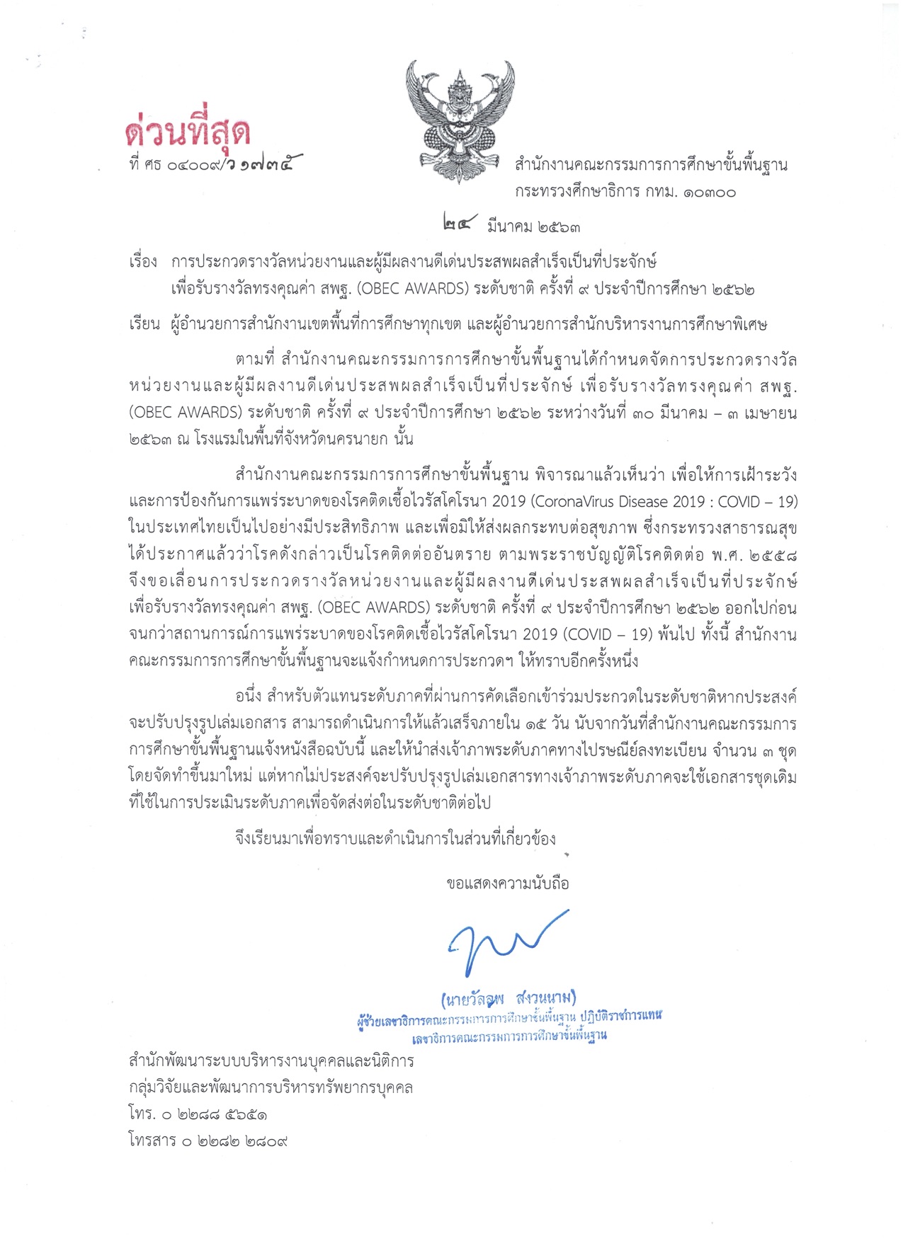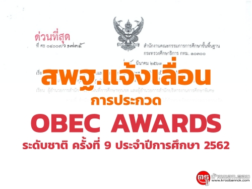 รายละเอียดคือแจ้งเลื่อนกำหนดการประกวดรางวัลหน่วยงานและผู้มีผลงานดีเด่นประสพผลสำเร็จเป็นที่ประจักษ์ เพื่อรับรางวัลทรงคุณค่า สพฐ. (OBEC AWARDS) ระดับชาติ ครั้งที่ 9 ประจำปีการศึกษา 2562 ออกไปจนกว่าสถานการณ์ไวรัสโควิด-19 จะคลี่คลาย ดังรายละเอียด