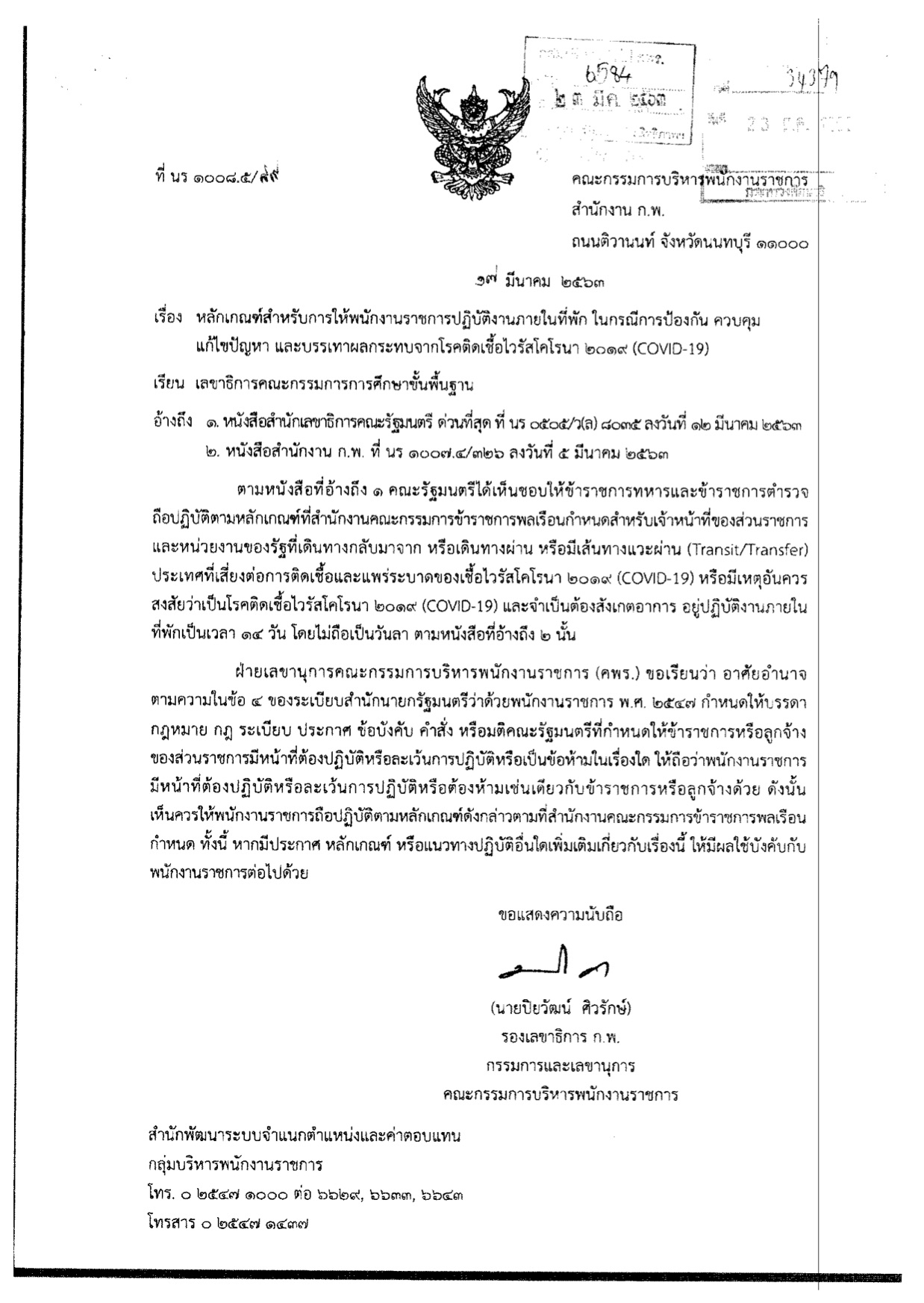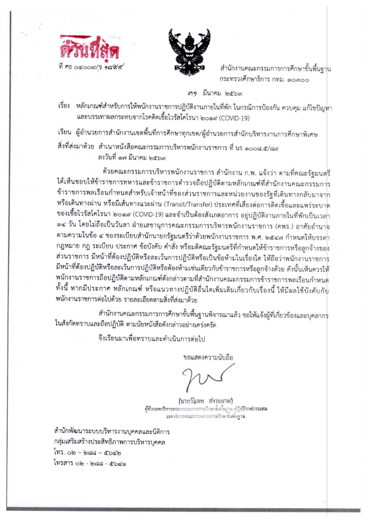 ที่ ศธ 04009/ว1899 หลักเกณฑ์สำหรับการให้พนักงานราชการปฏิบัติงานภายในที่พัก ในกรณีการป้องกัน ควบคุม แก้ไขปัญหาและบรรเทาผลกระทบจากโรคติดเชื้อไวรัสโคโรนา 2019(COVID-19)