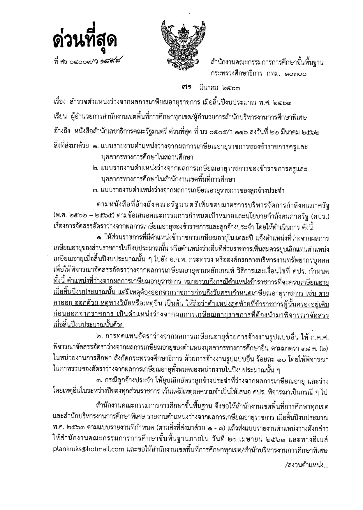 ที่ ศธ 04009/ว1898 สำรวจตำแหน่งว่างจากผลการเกษียณอายุราชการ เมื่อสิ้นปีงบประมาณ พ.ศ. 2563