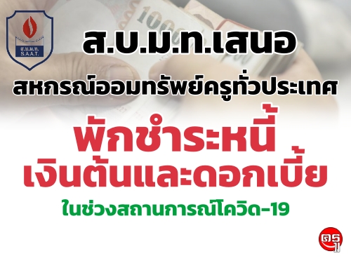 ดังนั้น ส.บ.ม.ท.จึงขอวิงวอนให้สหกรณ์ออมทรัพย์ครูทุกสหกรณ์ทั้งประเทศได้กรุณาพร้อมใจกันแสดงน้ำให้เห็นเป็นที่ประจักษ์ในฐานะท่ีเป็นสหกรณ์ของคุณครูและช่วยเหลือคุณครูด้วยการพักชำระเงินต้นและดอกเบี้ยให้โดยอัตโนมัติเป็นเวลาอย่างน้อยหกเดือนจนกว่าสถานการณ์จะคลี่คลาย โดยการพักชำระหนี้ทั้งเงินต้นและดอกเบี้ยดังกล่าวต้องไม่คิดดอกเบี้ยในระหว่างการพักชำระหนี้ หรือดำเนินการโดยวิธีการอื่นใดอันแสดงให้เห็นถึงการให้ความช่วยเหลือคุณครูในฐานะที่เป็นแหล่งเงินทุนที่ยิ่งใหญ่ เพื่อท่ีคุณครูที่เป็นสมาชิกสหกรณ์และได้กู้ยืมเงินจากสหกรณ์ไว้จะสามารถดำรงชีวิตได้ภายใต้แรงกดดันทางเศรษฐกิจอันเนื่องมาจากการแพร่ระบาดของไวรัส COVID -19 ต่อไป