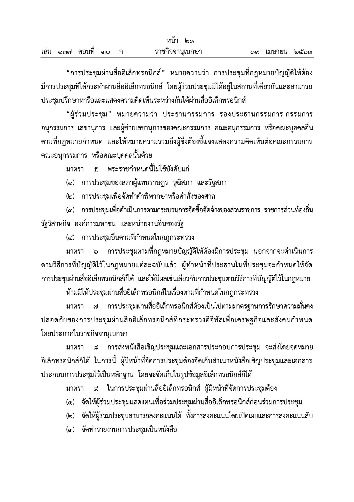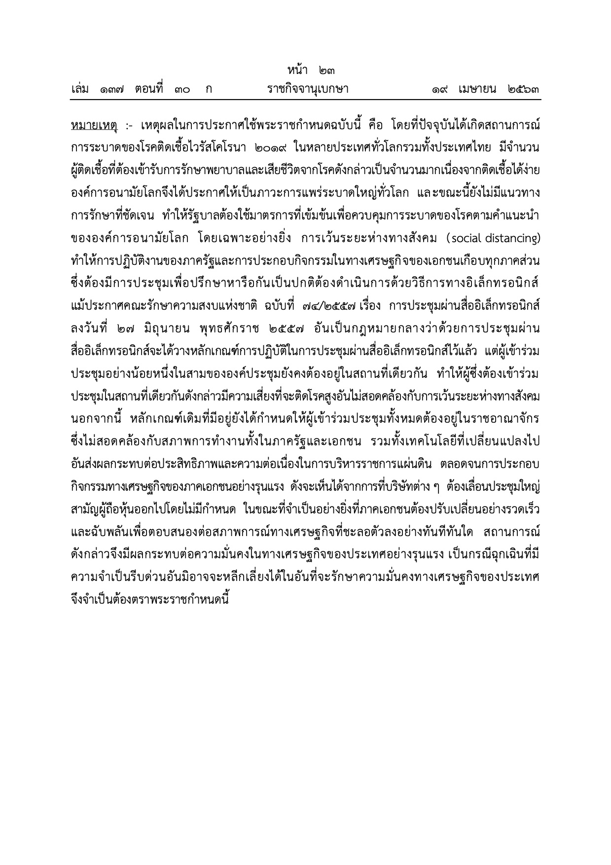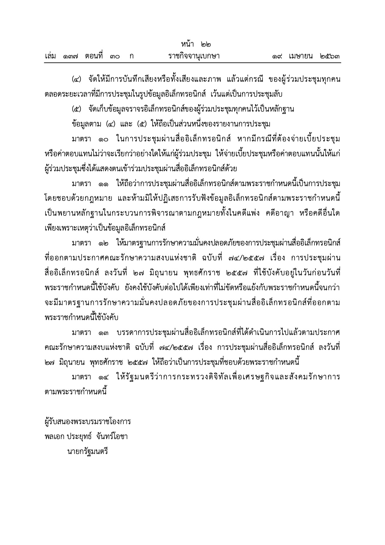 เมื่อวันที่ 19 เมษายน 2563 ราชกิจจานุเบกษา ได้เผยแพร่ พระราชกำหนดว่าด้วยการประชุมผ่านสื่ออิเล็กทรอนิกส์ พ.ศ.2563 รายละเอียด ดังนี้