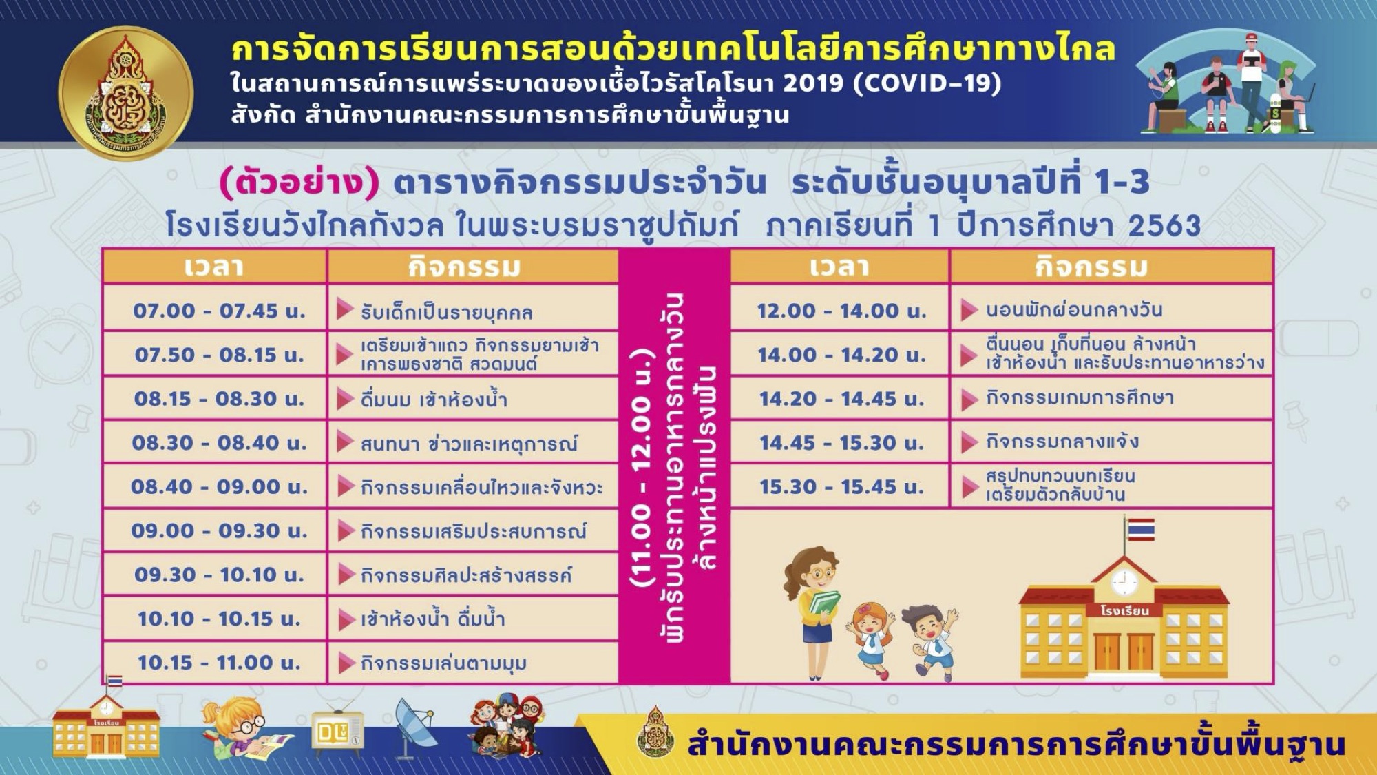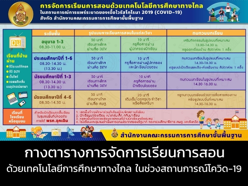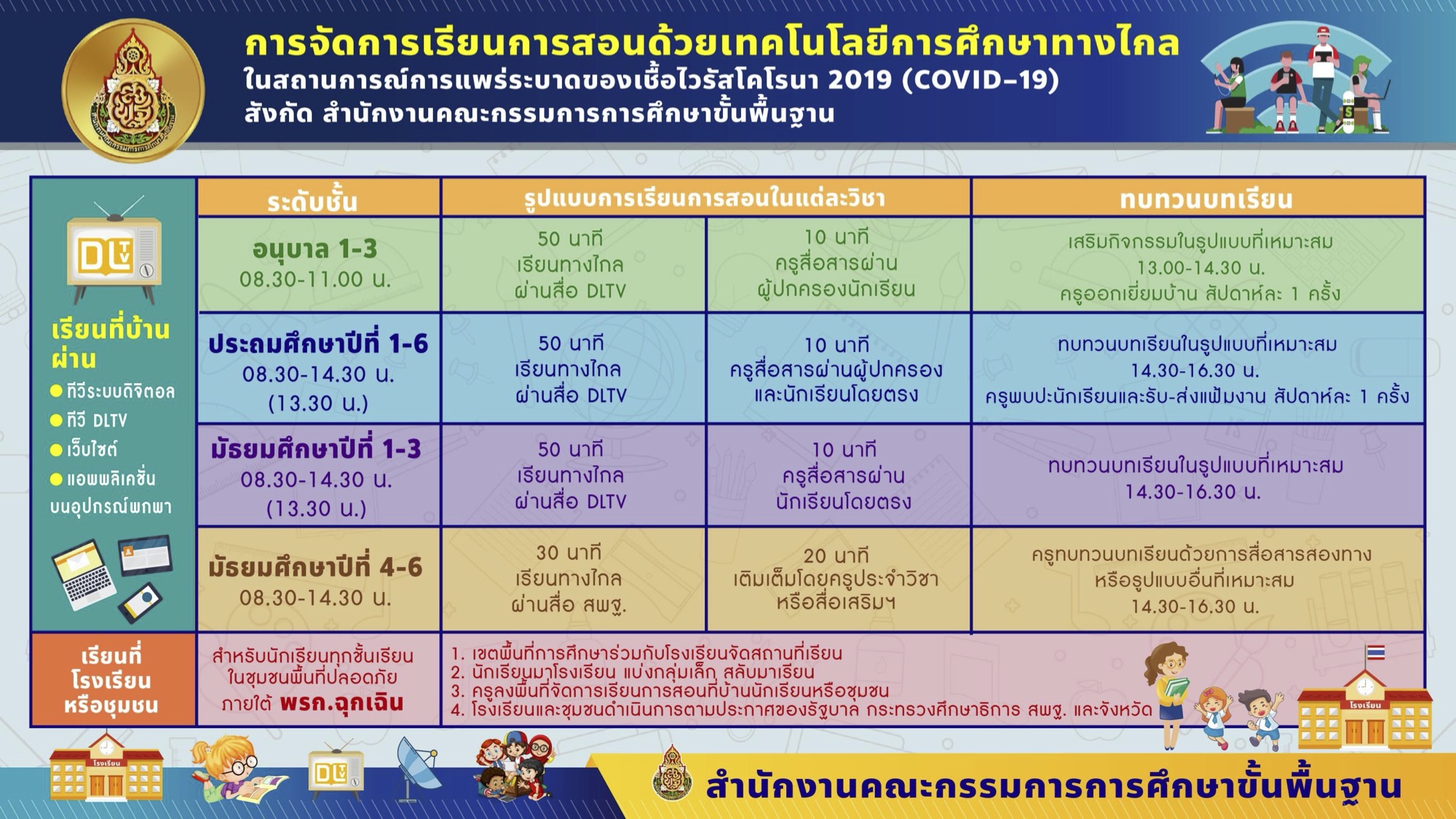 เมื่อวันที่ 30 เมษายน 2563 สำนักงานคณะกรรมการการศึกษาขั้นพื้นฐาน (สพฐ.) ได้จัดการประชุม ผอ.สพท.ทั่วประเทศ ครั้งที่ 4/2563 เพื่อหารือเกี่ยวกับการจัดการศึกษาทางไกลในสถานการณ์โรคติดเชื้อไวรัสโคโรนา 2019 (COVID-19) ซึ่ง ทาง สพฐ. ได้นำเสนอตารางการจัดกิจกรรมการเรียนการสอนด้วยเทคโนโลยีการศึกษาทางไกล เพื่อเป็นแนวทางให้โรงเรียนและผู้ปกครอง ได้ร่วมมือกันในการจัดการเรียนรู้ในนักเรียนและบุตรหลานในช่วงสถานการณ์โควิด-19 แพร่ระบาด ดังนี้