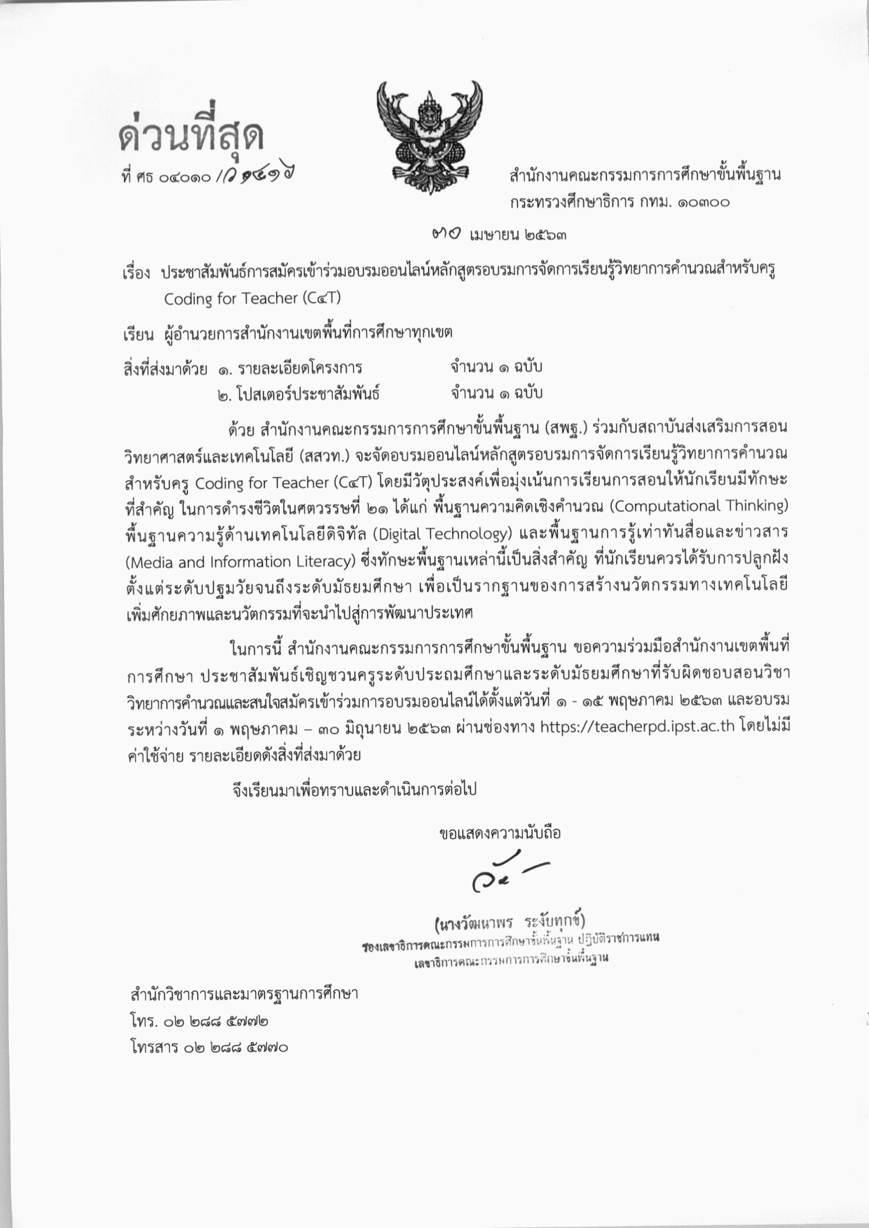 สพฐ.และ สสวท.จึงขอประชาสัมพันธ์เชิญชวนครูระดับประถมศึกษาและระดับมัธยมศึกษาที่รับผิดชอบสอนวิชาวิทยาการคำนวณและสนใจสมัครเข้าร่วมการอบรมออนไลน์ได้ตั้งแต่วันที่ 1 - 15 พฤษภาคม 2563 และอบรม ระหว่างวันที่ 1 พฤษภาคม -30 มิถุนายน 2563 ผ่านช่องทาง https:/teacherpd.ipst.ac.th โดยไม่มีค่าใช้จ่าย