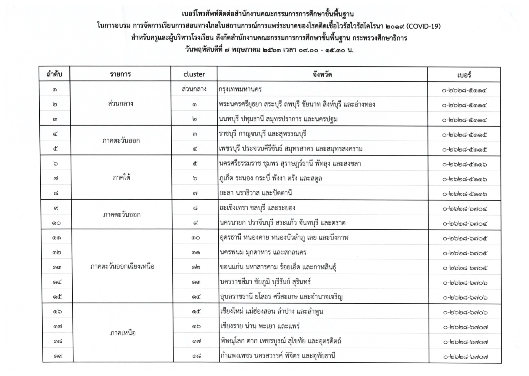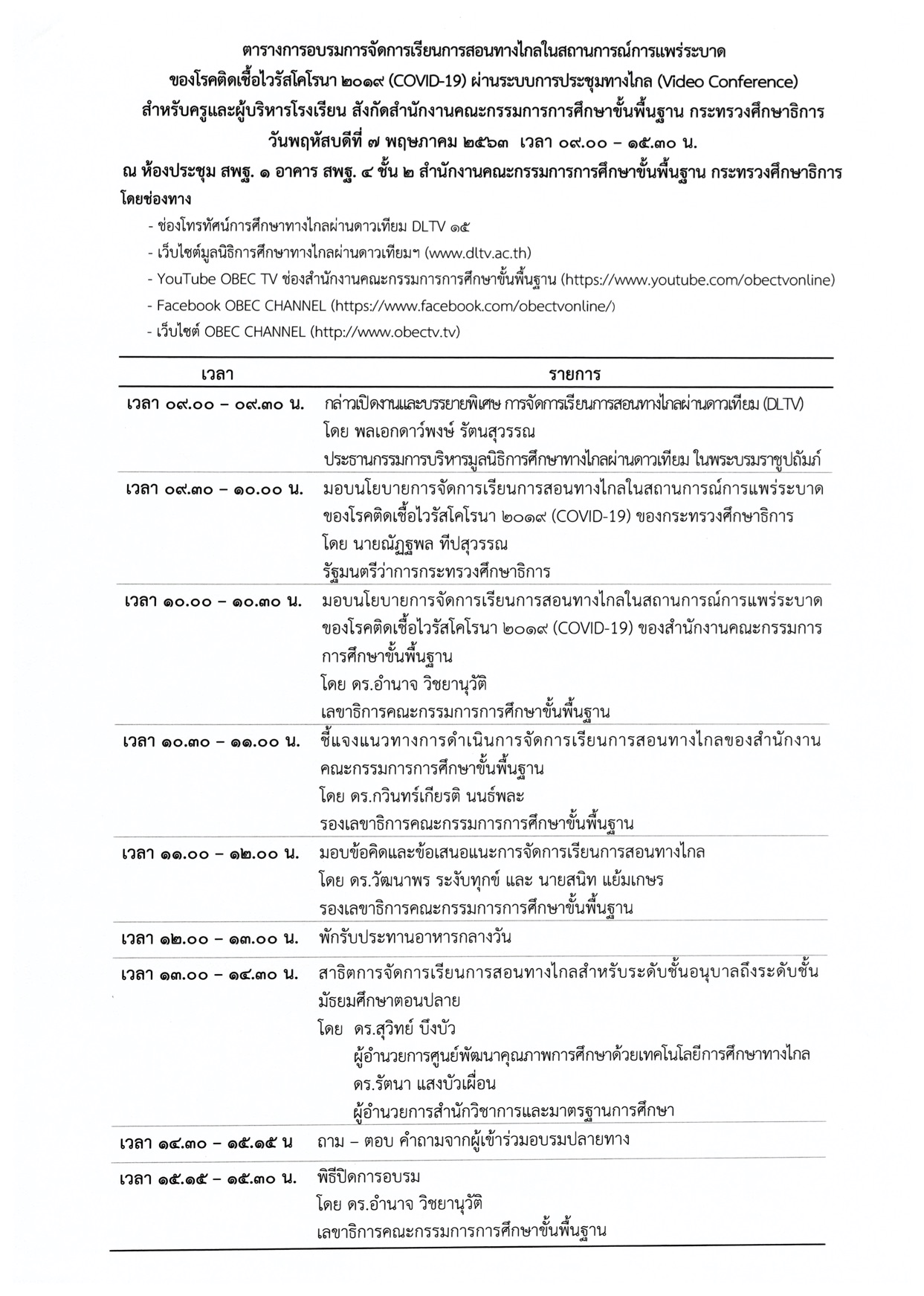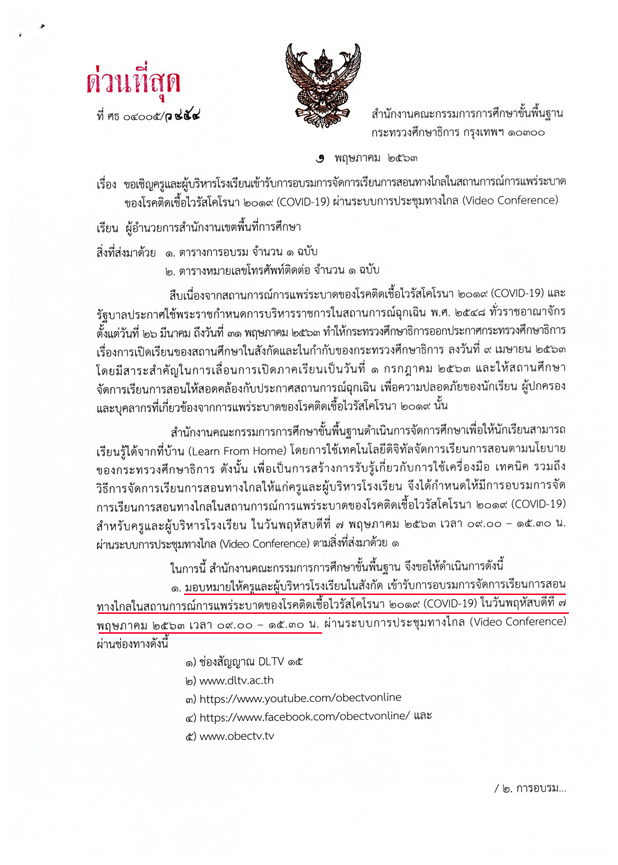1. มอบหมายให้ครูและผู้บริหารโรงเรียนในสังกัด เข้ารับการอบรมการจัดการเรียนการสอนทางไกลในสถานการณ์การแพร่ระบาดของโรคติดเชื้อไวรัสโคโรนา 2019 (COVID-19) ในวันพฤหัสบดีที่ 7 พฤษภาคม 2563 เวลา 09.00 - 15.30 น. ผ่านระบบการประชุมทางไกล (Video Conference) ผ่านช่องทางดังนี้