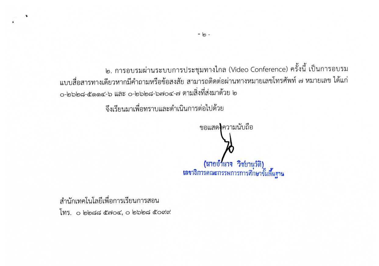 ขอเชิญครูและผู้บริหารโรงเรียนเข้ารับการอบรมการจัดการเรียนการสอนทางไกลในสถานการณ์การแพร่ระบาดของโรคติดเชื้อไวรัสโคโรนา 2019 (COVID-19) ผ่านระบบการประชุมทางไกล (Video Conference)