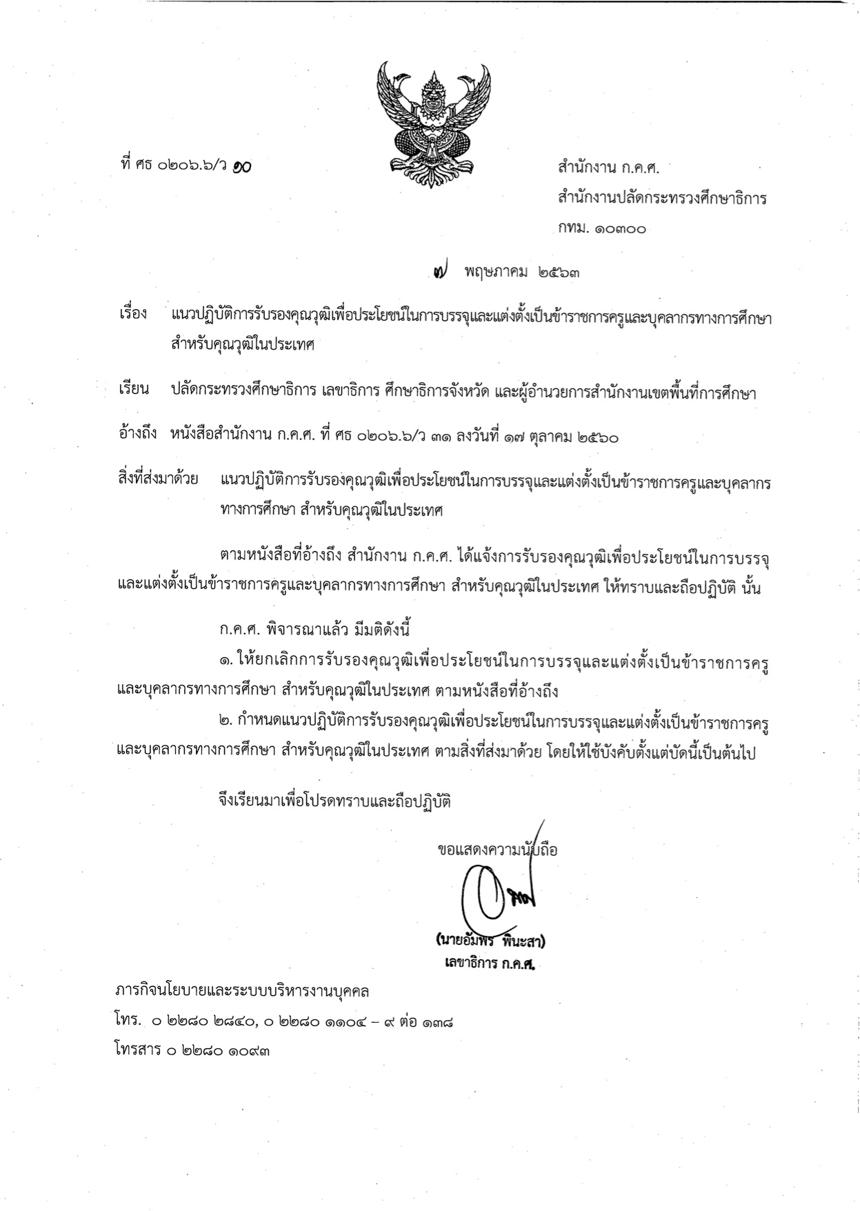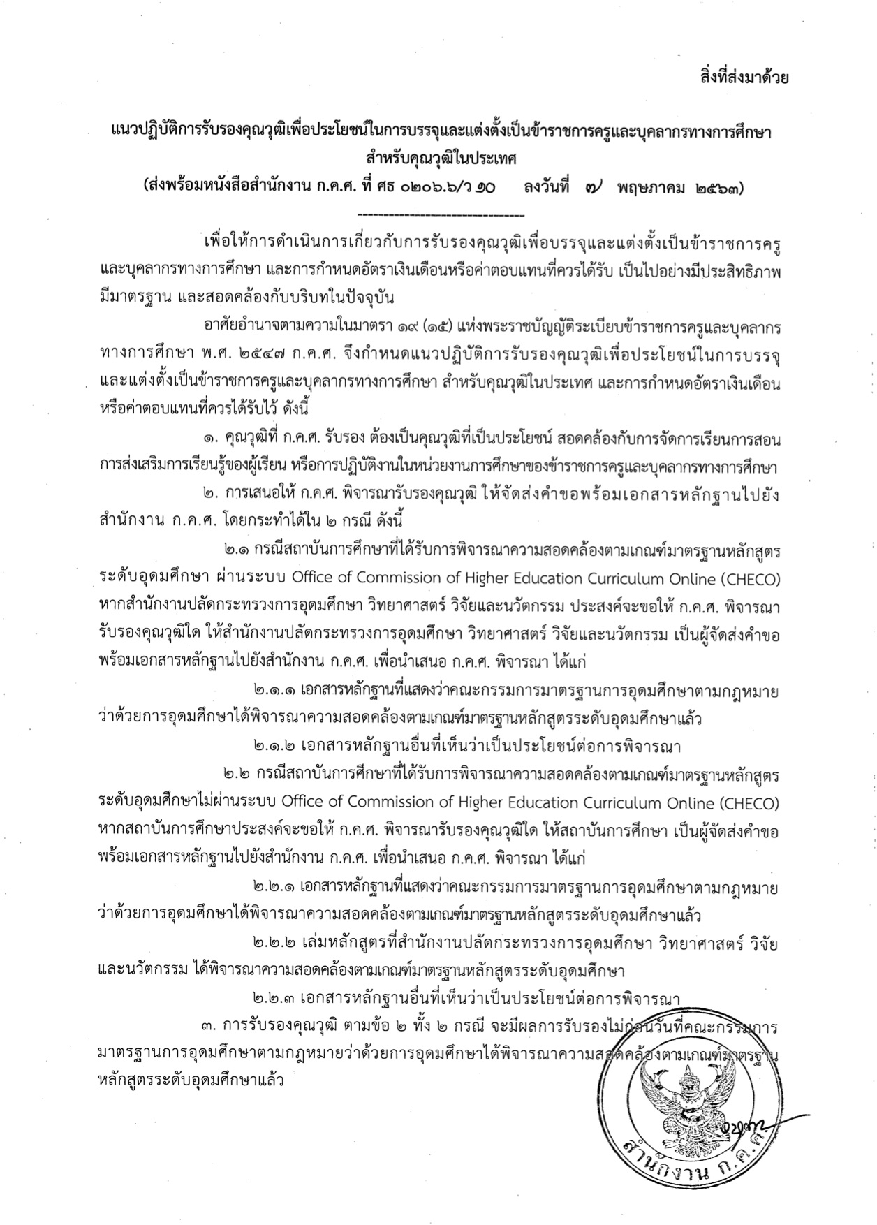 ว10/2563 แนวปฏิบัติการรับรองคุณวุฒิเพื่อประโยชน์ในการบรรจุและแต่งตั้งเป็นข้าราชการครูและบุคลากรทางการศึกษา สำหรับคุณวุฒิในประเทศ
