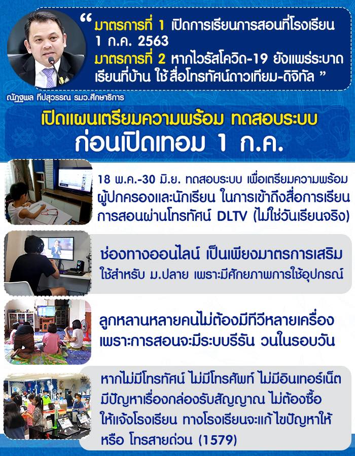 - 18 พ.ค.-30 มิ.ย. ทดสอบระบบ เพื่อเตรียมความพร้อมผู้ปกครองและนักเรียน ในการเข้าถึงสื่อการเรียนการสอนผ่านโทรทัศน์ DTV (ไม่ใช่วันเรียนจริง)