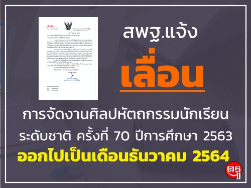1. เลื่อนการจัดงานศิลปหัตถกรรมนักเรียน ระดับชาติ ครั้งที่ 70 ปีการศึกษา 2563 ออกไป 1 รอบปี จากเดือนธันวาคม 2563 ไปเดือนธันวาคม 2564