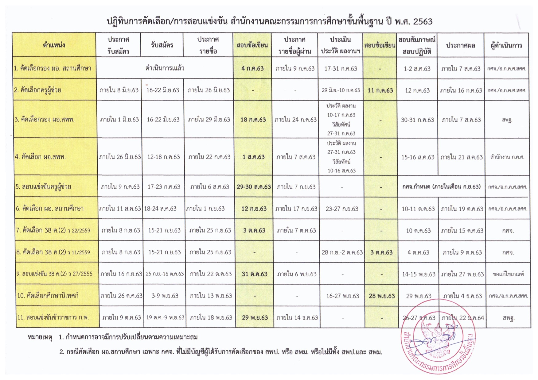 ปฏิทินการคัดเลือก/การสอบแข่งขัน สำนักงานคณะกรรมการการศึกษาขั้นพื้นฐาน ปี พ.ศ. 2563 ส่งแนบมาพร้อมหนังสือ ด่วนที่สุด ที่ ศธ 04009/ว 2840,2841 เรื่อง มาตราการป้องกันการทุจริตในการสรรหาข้าราชการ สังกัดสำนักงานคณะกรรมการการศึกษาขั้นพื้นฐาน ปี พ.ศ. 2563