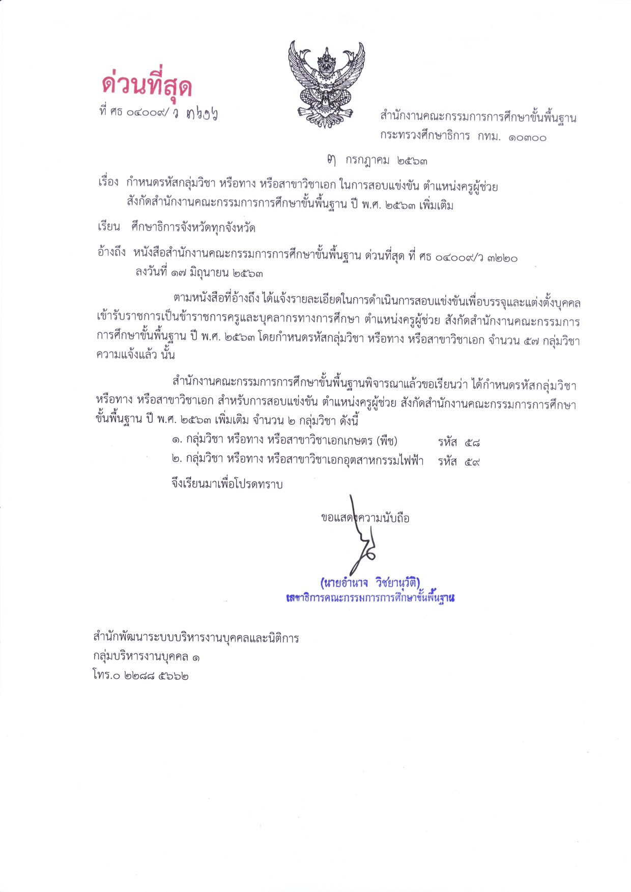กำหนดรหัสกลุ่มวิชา หรือทาง หรือสาขาวิชาเอก ในการสอบแข่งขัน ตำแหน่งครูผู้ช่วย สังกัด สพฐ. ปี พ.ศ. 2563 เพิ่มเติม