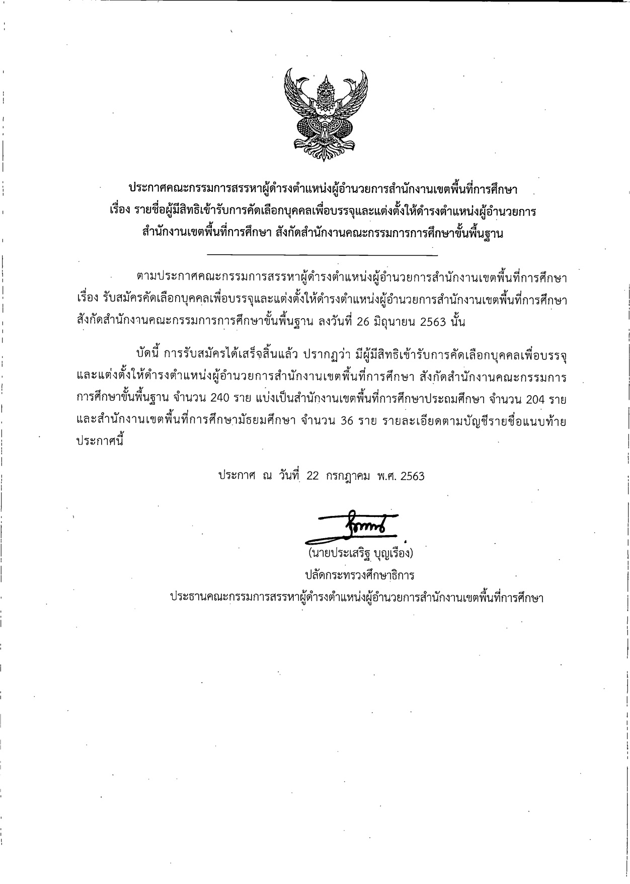 ประกาศ รายชื่อผู้มีสิทธิเข้ารับการคัดเลือกบุคคลเพื่อบรรจุและแต่งตั้งให้ดำรงตำแหน่งผู้อำนวยการสำนักงานเขตพื้นที่การศึกษา สังกัดสำนักงานคณะกรรมการการศึกษาขั้นพื้นฐาน