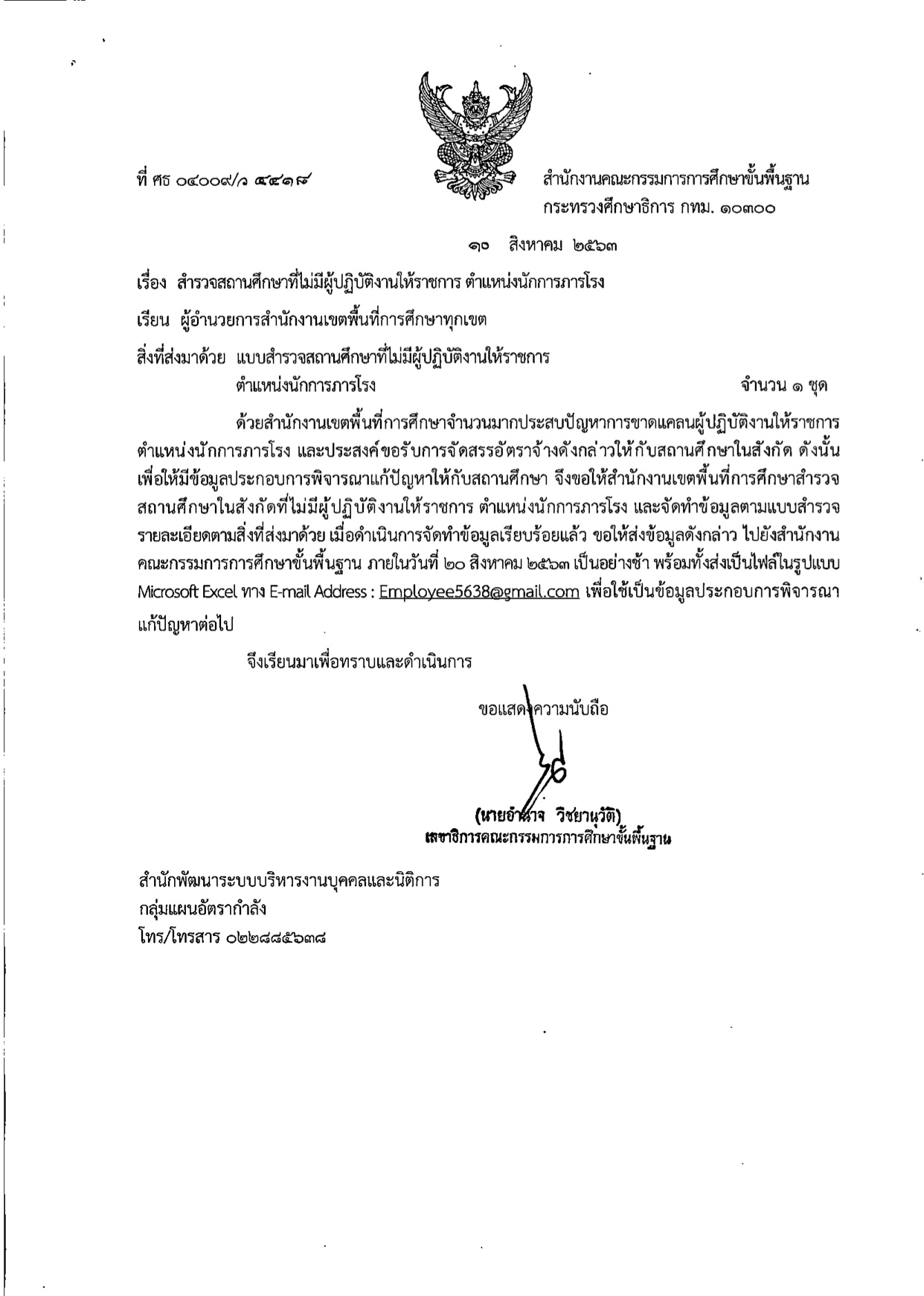 สำนักงานคณะกรรมการการศึกษาขั้นพื้นฐาน สำรวจสถานศึกษาที่ไม่มีผู้ปฏิบัติงานให้ราชการ ตำแหน่งนักการภารโรง