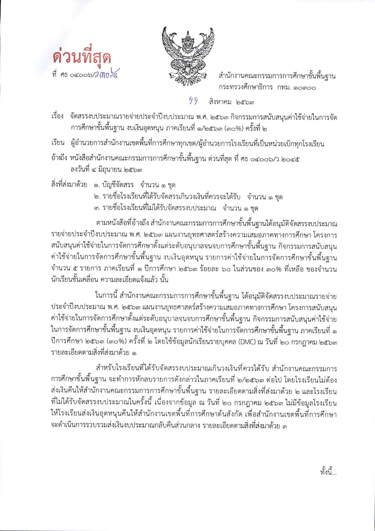จัดสรรงบประมาณรายจ่ายประจำปีงบประมาณ พ.ศ. 2563 กิจกรรมการสนับสนุนค่าใช้จ่ายในการจัดการศึกษาขั้นพื้นฐาน งบเงินอุดหนุน ภาคเรียนที่ 1/2563 (30%) ครั้งที่ 2