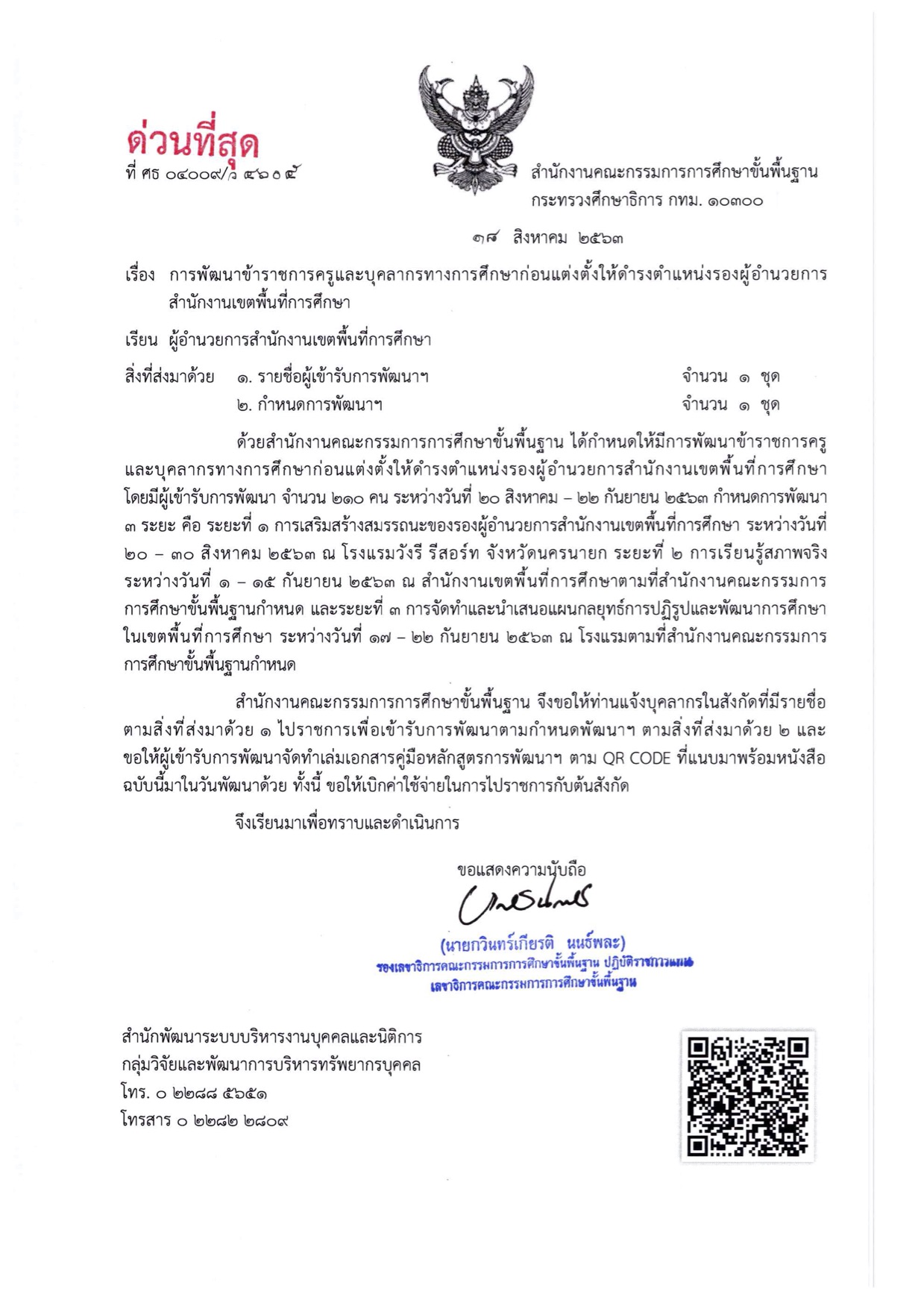 ด่วนที่สุด ที่ ศธ 04009/ว 4605 เรื่อง การพัฒนาข้าราชการครูและบุคลากรทางการศึกษาก่อนแต่งตั้งให้ดำรงตำแหน่งรองผู้อำนวยการสำนักงานเขตพื้นที่การศึกษา