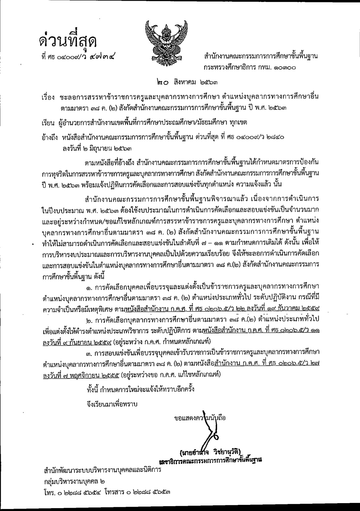 ที่ ศธ 04009/ว4734 ชะลอการสรรหาข้าราชการครูและบุคลากรทางการศึกษา ตำแหน่งบุคลากรทางการศึกษาอื่น ตามมาตรา 38 ค.(2) สังกัด สพฐ. ปี พ.ศ.2563