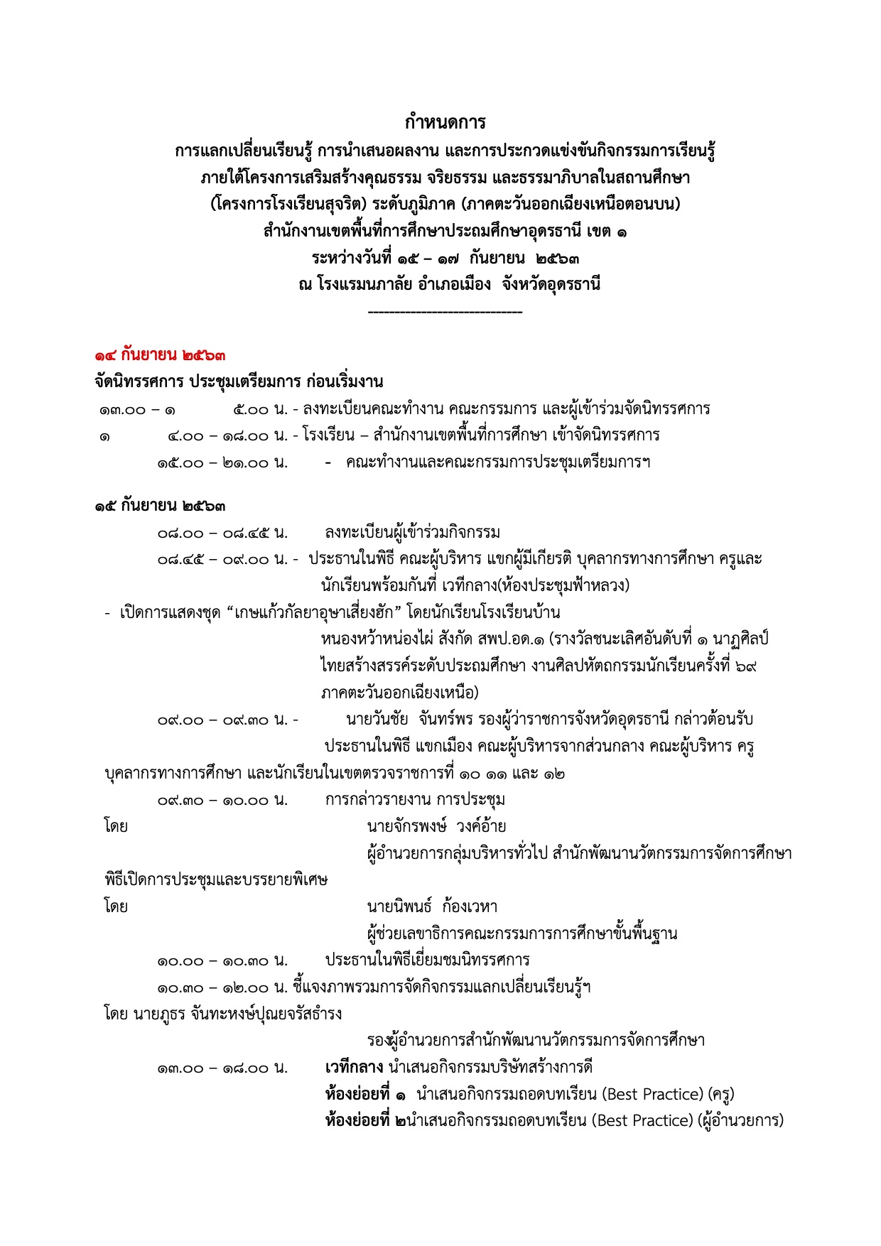 สำนักงานคณะกรรมการการศึกษาขั้นพื้นฐาน(สพฐ.) โดยสำนักนวัตกรรมการจัดการศึกษา(สนก.) ร่วมกับสำนักงานคณะกรรมการป้องกันและปราบปรามการทุจริตแห่งชาติ (สำนักงานป.ป.ช.) เตรียมจัดกิจกรรมการแลกเปลี่ยนเรียนรู้ การนำเสนอผลงาน และการประกวดแข่งขัน กิจกรรมการเรียนรู้ ภายใต้โครงการเสริมสร้างคุณธรรม จริยธรรม และธรรมาภิบาลในสถานศึกษา (โครงการโรงเรียนสุจริต) ระดับภูมิภาค (ภาคตะวันออกเฉียงเหนือตอนบน) สำนักงานเขตพื้นที่การศึกษาในเขตตรวจราชการที่ 10 11 และ 12 ระหว่างวันที่ 15 – 17 กันยายน 2563 ณ โรงแรมนภาลัย อำเภอเมือง จังหวัดอุดรธานี