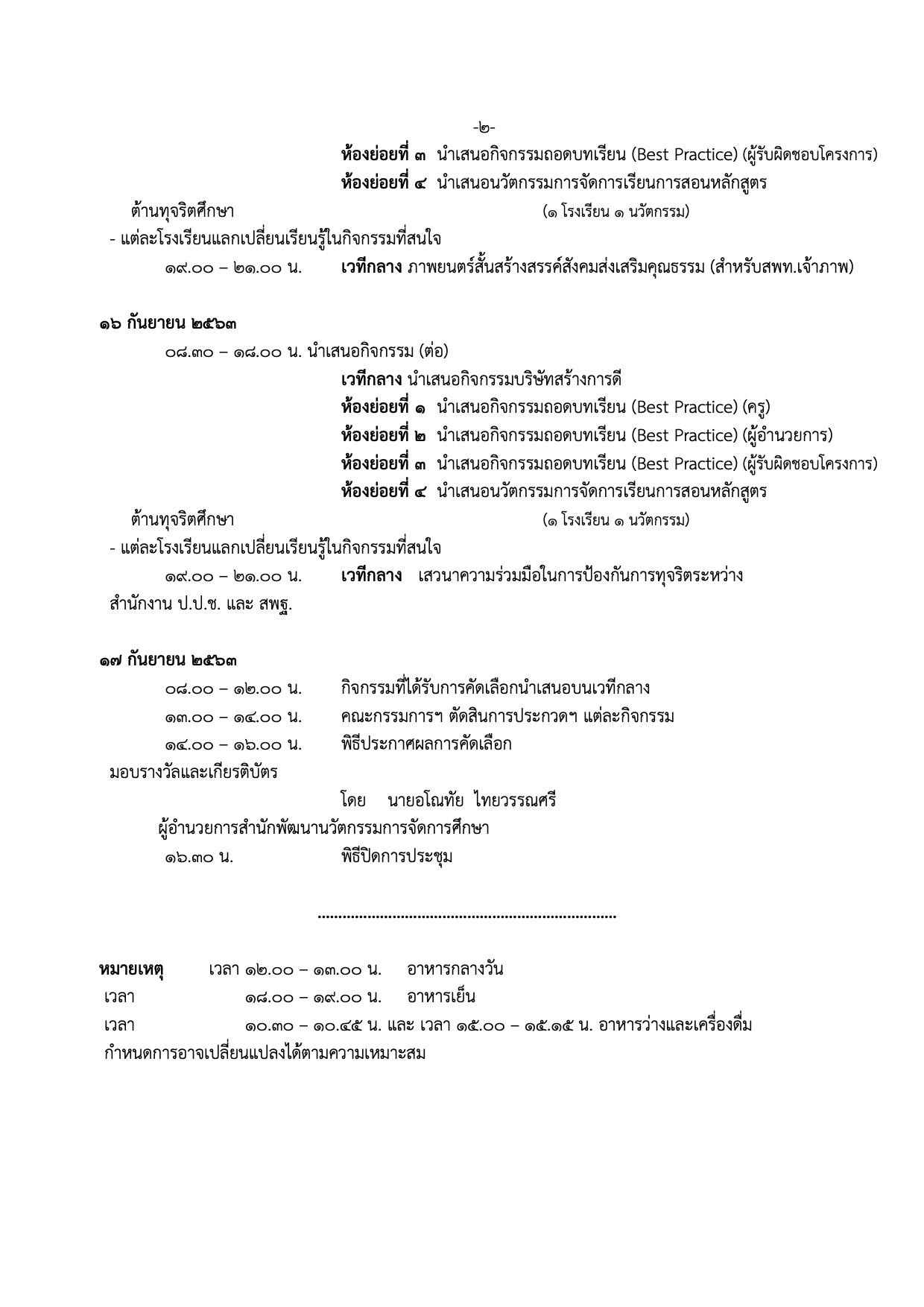 โดยในงานจะมีนิทรรศการของโรงเรียน การนำเสนอกิจกรรมถอดบทเรียน (Best Practice) การนำเสนอนวัตกรรมการจัดการเรียนการสอนหลักสูตรต้านทุจริตศึกษา เสวนาความร่วมมือในการป้องกันการทุจริตระหว่างสานักงาน ป.ป.ช. และ สพฐ. และการประกวดในแต่ละกิจกรรม โดยรายละเอียดและกำหนดการ ดังนี้