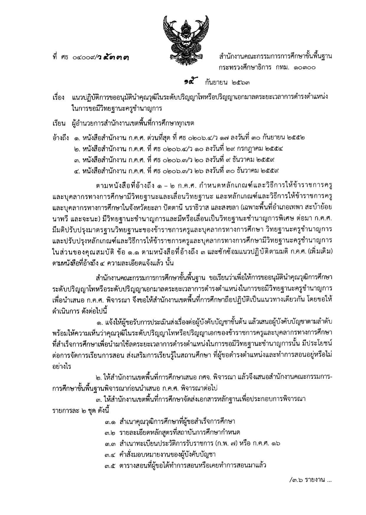 ที่ ศธ 04009/ว5333 แนวปฏิบัติการขออนุมัตินำคุณวุฒิในระดับปริญญาโทหรือปริญญาเอกมาลดระยะเวลาการดำรงตำแหน่ง ในการขอมีวิทยฐานะครูชำนาญการ