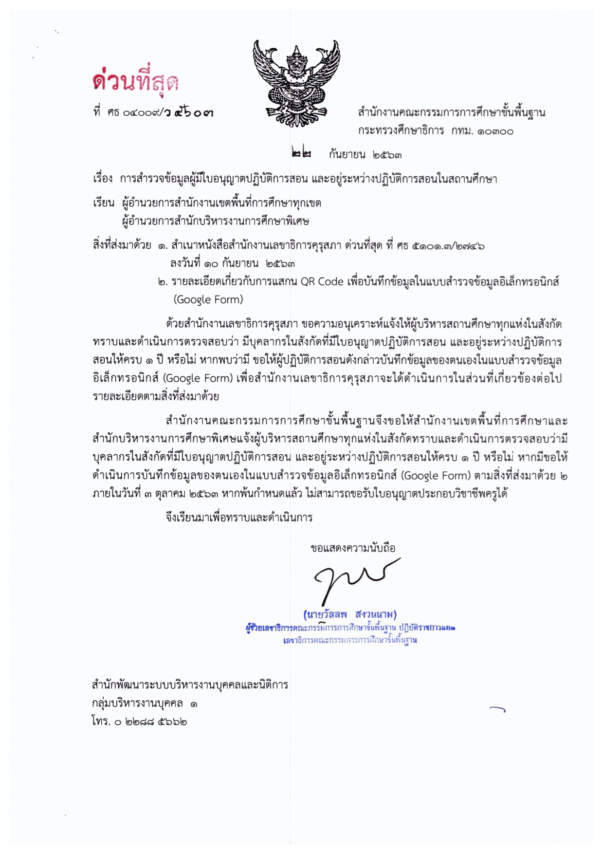 ด่วนที่สุด ที่ ศธ 04009/ว 5603 การสำรวจข้อมูลผู้มีใบอนุญาตปฏิบัติการสอน และอยู่ระหว่างปฏิบัติการสอนในสถานศึกษา
