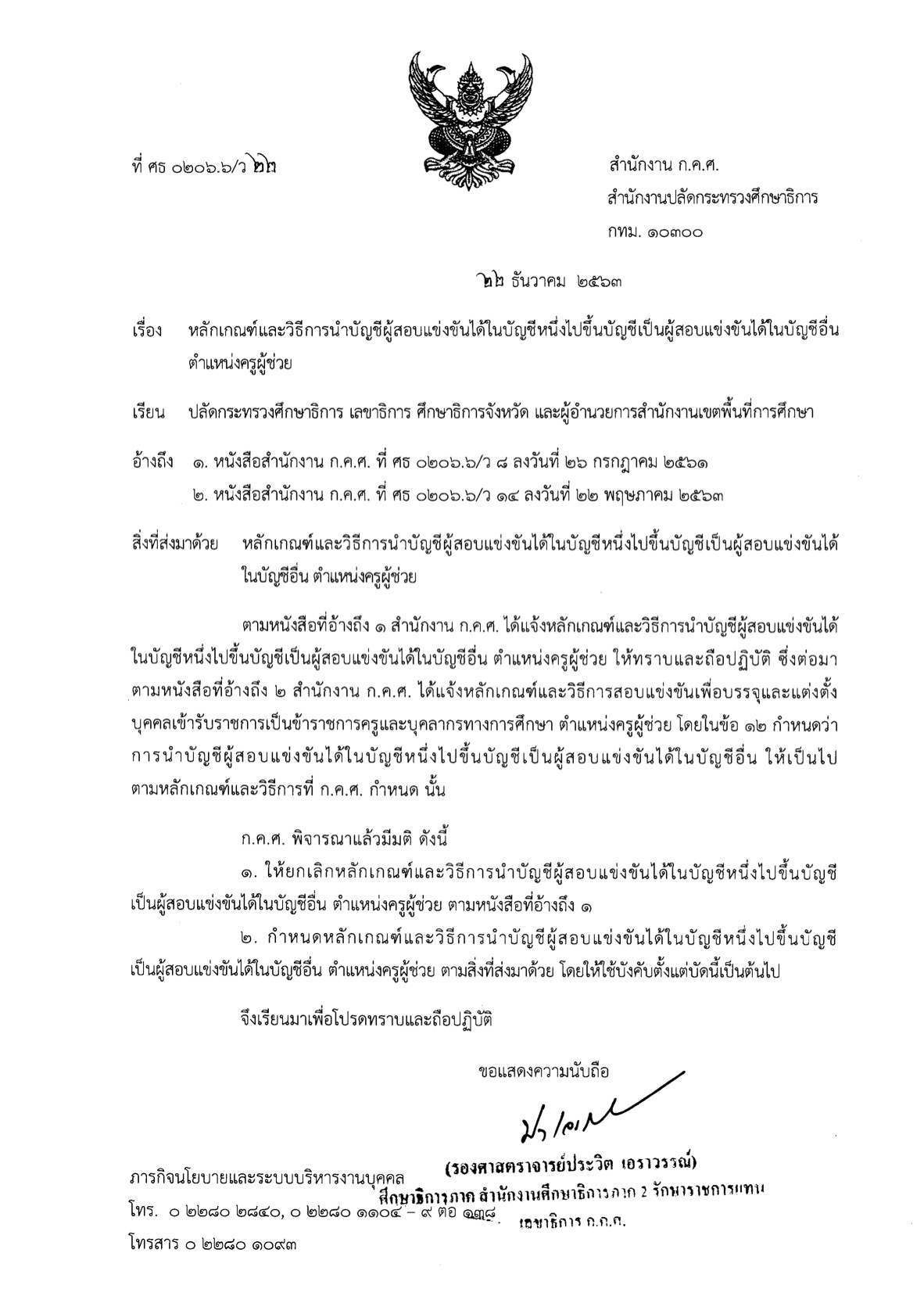 ว22/2563 หลักเกณฑ์และวิธีการนำบัญชีผู้สอบแข่งขันได้ในบัญชีหนึ่งไปขึ้นบัญชีเป็นผู้สอบแข่งขันได้ในบัญชีอื่นตำแหน่งครูผู้ช่วย