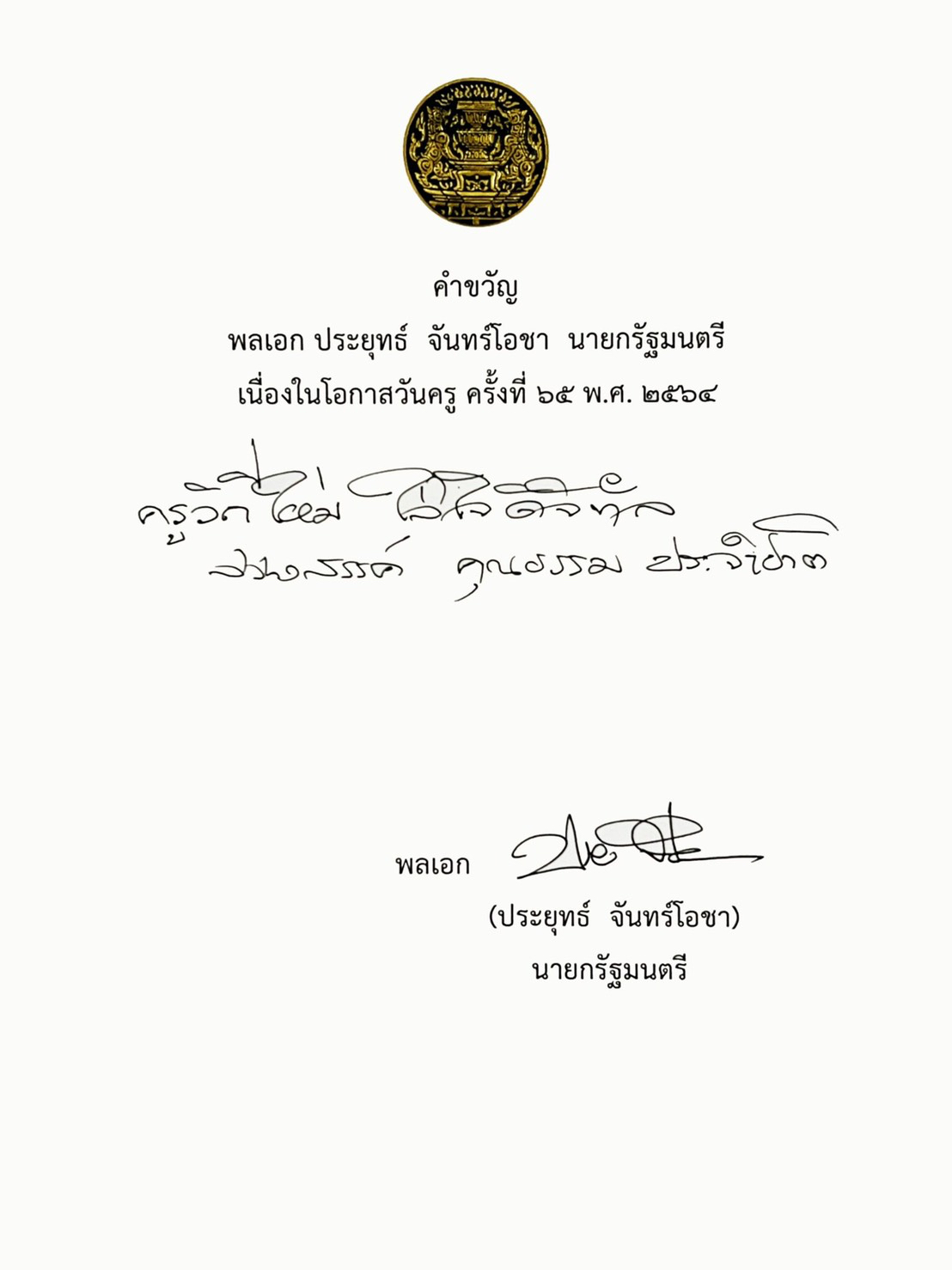 วันที่ 30 ธ.ค. 2563 พลเอกประยุทธ์ จันทร์โอชา นายกรัฐมนตรีและรัฐมนตรีว่าการกระทรวงกลาโหม ได้มอบคำขวัญ เนื่องในโอกาสวันครู ครั้งที่ 65 พ.ศ. 2564 ว่า