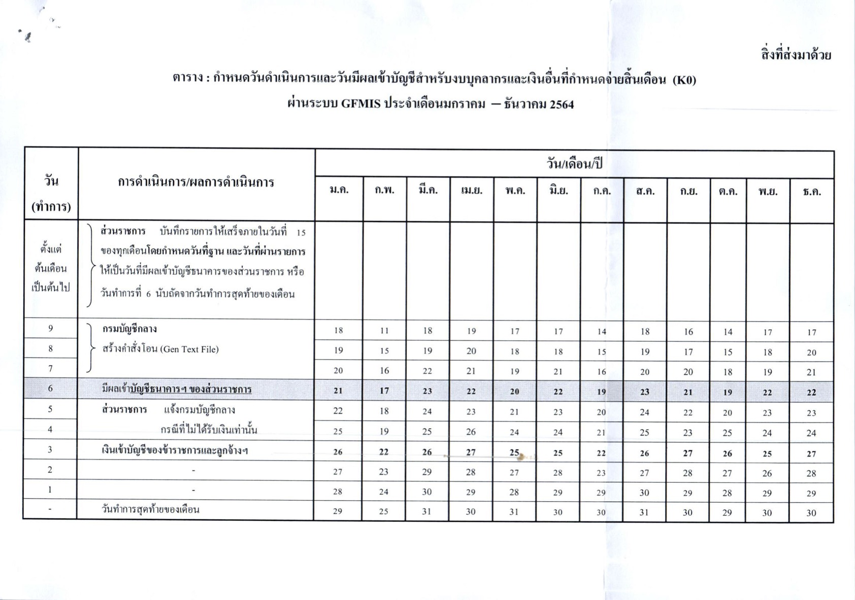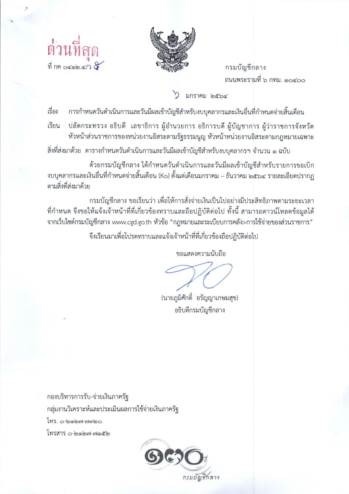 กรมบัญชีกลาง ออกหนังสือแจ้งทุกส่วนราชการ เรื่อง การกำหนดวันดำเนินการและวันมีผลเข้าบัญชีสำหรับงบบุคลากรและเงินอื่นที่กำหนดจ่ายสิ้นเดือน (ว5) ประกาศวันที่ 6 ม.ค.2564 รายละเอียด ดังนี้
