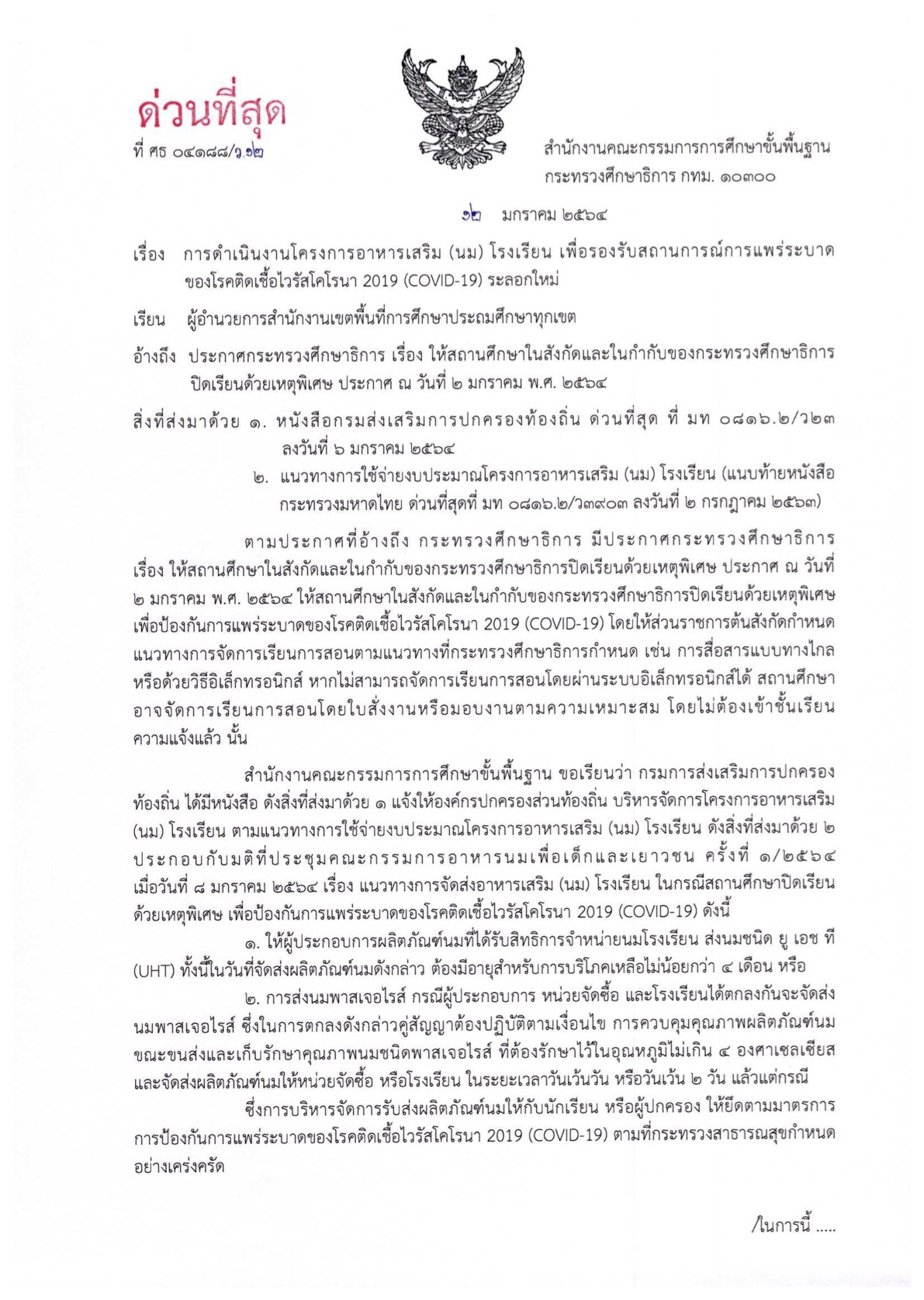สำนักงานคณะกรรมการการศึกษาขั้นพื้นฐาน ได้มีหนังสือแจ้ง เรื่อง การดำเนินงานโครงการอาหารเสริม(นม) โรงเรียน เพื่อรองรับสถานการณ์การแพร่ระบาดของโรคติดเชื้อไวรัสโคโรนา 2019 (COVID-19) ระลอกใหม่ โดยมีรายละเอียด ดังนี้