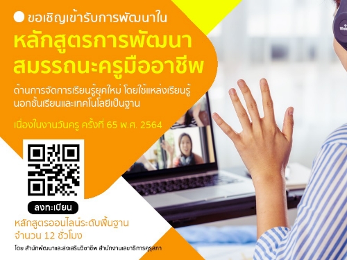 คุรุสภาขอเชิญเข้ารับการพัฒนาในหลักสูตรการพัฒนาสมรรถนะครูมืออาชีพออนไลน์ ด้านการจัดการเรียนรู้ยุคใหม่ เนื่องในงานวันครู ครั้งที่ 65 พ.ศ. 2564 ฟรี ไม่มีค่าใช้จ่าย