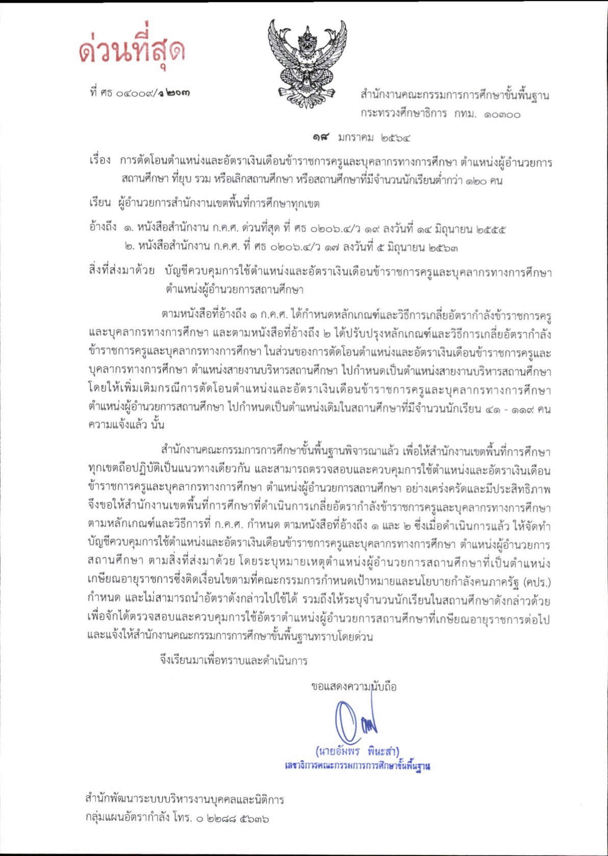 ด่วนที่สุด ที่ ศธ 04009/ว203 เรื่อง การตัดโอนตำแหน่งและอัตราเงินเดือนข้าราชการครูและบุคลากรทางการศึกษา ตำแหน่งผู้อำนวยการสถานศึกษา ที่ยุบ รวม หรือเลิกสถานศึกษา หรือสถานศึกษาที่มีจำนวนนักเรียนต่ำกว่า 120 คน