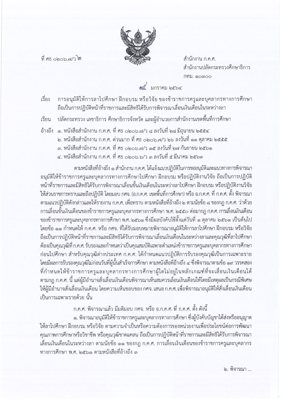 ว2/2564 การอนุมัติให้การลาไปศึกษา ฝึกอบรม หรือวิจัย ของข้าราชการครูและบุคลากรทางการศึกษา ถือเป็นการปฏิบัติหน้าที่ราชการและมีสิทธิได้รับการพิจารณาเลื่อนเงินเดือนในระหว่างลา