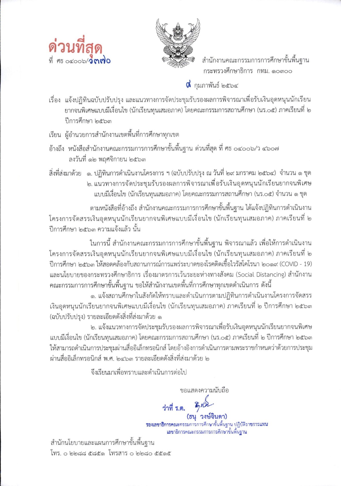 แจ้งปฏิทินฉบับปรับปรุงและแนวทางการจัดประชุมรับรองผลการพิจารณาเพื่อรับเงินอุดหนุนนักเรียนยากจนพิเศษแบบมีเงื่อนไข (นักเรียนทุนเสมอภาค) โดยคณะกรรมการสถานศึกษา (นร.05) ภาคเรียนที่ 2 ปีการศึกษา 2563
