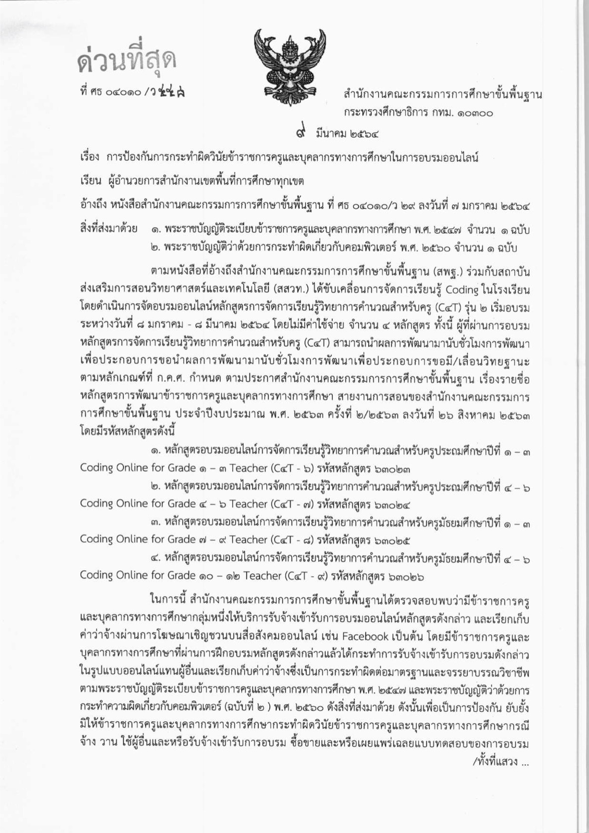 สำนักงานคณะกรรมการการศึกษาขั้นพื้นฐาน มีหนังสือ ที่ ศธ.04010/ว558 ลงวันที่ 9 มีนาคม 2564 ถึง ผู้อำนวยการสำนักงานเขตพื้นที่การศึกษาทุกเขต เรื่อง การป้องกันการกระทำผิดวินัยข้าราชการครูและบุคลากรทางการศึกษาในการอบรมออนไลน์ กรณีการตรวจพบการรับจ้างอบรมออนไลน์หลักสูตร C4T เพื่อเป็นการแจ้งย้ำเตือนข้าราชการครูและบุคลากรทางการศึกษา มิให้กระทำการดังกล่าวอันจะเป็นเหตุผิดวินัยอย่างร้ายแรง