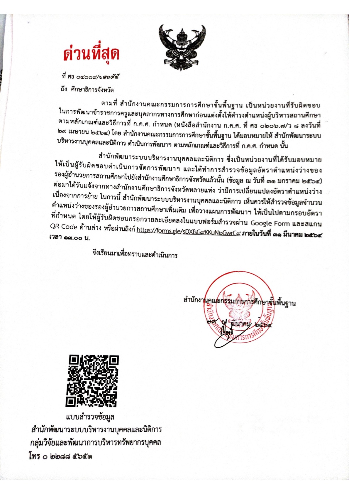 สำนักงานคณะกรรมการการศึกษาขั้นพื้นฐาน มีหนังสือแจ้งสำรวจข้อมูลตำแหน่งว่างของรองผู้อำนวยการสถานศึกษา