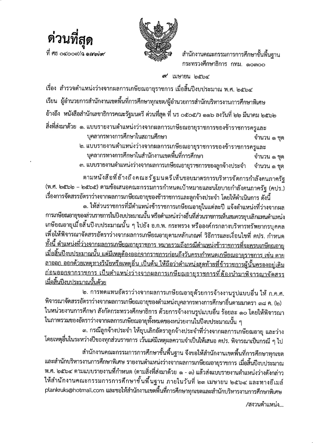 สํานักงานคณะกรรมการการศึกษาขั้นพื้นฐาน จึงขอให้สํานักงานเขตพื้นที่การศึกษาทุกเขต และสํานักบริหารงานการศึกษาพิเศษ รายงานตําแหน่งว่างจากผลการเกษียณอายุราชการ เมื่อสิ้นปีงบประมาณ พ.ศ. 2564 ตามแบบรายงานที่กําหนด แล้วส่งแบบรายงานตําแหน่งว่างดังกล่าว ให้สํานักงานคณะกรรมการการศึกษาขั้นพื้นฐาน ภายในวันที่ 23 เมษายน 2564 และทางอีเมล์ plankruksahotmail.com และขอให้สํานักงานเขตพื้นที่การศึกษาทุกเขตและสํานักบริหารงานการศึกษาพิเศษ สงวนตําแหน่งว่างดังกล่าวไว้ จนกว่าสํานักงานคณะกรรมการการศึกษาขั้นพื้นฐานจะมีหนังสือแจ้งการจัดสรรคืน ยกเว้น ตําแหน่งผู้บริหารการศึกษา (ผู้อํานวยการสํานักงานเขตพื้นที่การศึกษาและรองผู้อํานวยการสํานักงาน เขตพื้นที่การศึกษา) และตําแหน่งผู้บริหารสถานศึกษา (ผู้อํานวยการสถานศึกษาและรองผู้อํานวยการสถานศึกษา) ที่มีนักเรียนตั้งแต่ 120 คนขึ้นไป ซึ่งไม่อยู่ในแผนการถ่ายโอนให้แก่องค์กรปกครองส่วนท้องถิ่น หรือไม่อยู่ ในแผนการควบรวมสถานศึกษา ให้แต่งตั้งบุคคลในอัตราว่างดังกล่าวได้ทันที โดยให้ถือว่า คปร. อนุมัติ การจัดสรรคืนให้แล้ว ทั้งนี้ ขอให้สํานักงานเขตพื้นที่การศึกษาสําเนาข้อมูลดังกล่าวไว้สําหรับควบคุมการใช้ตําแหน่ง ให้ตรงกันด้วย