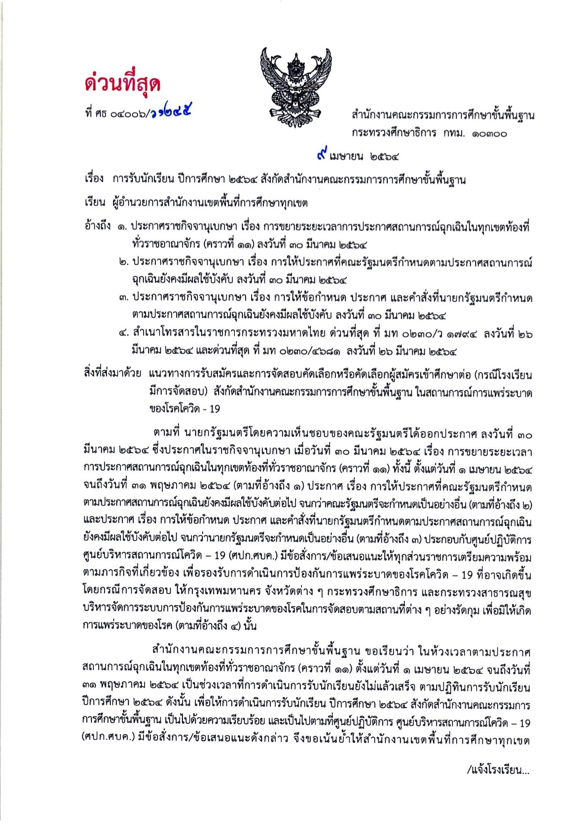 สำนักงานคณะกรรมการการศึกษาขั้นพื้นฐาน มีหนังสือ ที่ ศธ 04006/ว255 ลงวันที่ 9 เมษายน 2564 เรื่อง การรับนักเรียน ปีการศึกษา 2564 ตามที่ นายกรัฐมนตรีโดยความเห็นชอบของคณะรัฐมนตรีได้ออกประกาศ ลงวันที่ 30 มีนาคม 2564 ซึ่งประกาศในราชกิจจานุเบกษา เมื่อวันที่ 30 มีนาคม 2564 เรื่อง การขยายระยะเวลา การประกาศสถานการณ์ฉุกเฉินในทุกเขตท้องที่ทั่วราชอาณาจักร (คราวที่ 11) ทั้งนี้ ตั้งแต่วันที่ 1 เมษายน 2564 จนถึงวันที่ 31 พฤษภาคม 2564 ประกาศ เรื่อง การให้ประกาศที่คณะรัฐมนตรีกําหนด ตามประกาศสถานการณ์ฉุกเฉินยังคงมีผลใช้บังคับต่อไป จนกว่าคณะรัฐมนตรีจะกําหนดเป็นอย่างอื่น และประกาศ เรื่อง การให้ข้อกําหนด ประกาศ และคําสั่งที่นายกรัฐมนตรีกําหนดตามประกาศสถานการณ์ฉุกเฉิน ยังคงมีผลใช้บังคับต่อไป จนกว่านายกรัฐมนตรีจะกําหนดเป็นอย่างอื่น ประกอบกับศูนย์ปฏิบัติการ ศูนย์บริหารสถานการณ์โควิด - 19 (ศปก.ศบค.) มีข้อสั่งการ/ข้อเสนอแนะให้ทุกส่วนราชการเตรียมความพร้อม ตามภารกิจที่เกี่ยวข้อง เพื่อรองรับการดําเนินการป้องกันการแพร่ระบาดของโรคโควิด - 19 ที่อาจเกิดขึ้น โดยกรณีการจัดสอบ ให้กรุงเทพมหานคร จังหวัดต่าง ๆ กระทรวงศึกษาธิการ และกระทรวงสาธารณสุข บริหารจัดการระบบการป้องกันการแพร่ระบาดของโรคในการจัดสอบตามสถานที่ต่าง ๆ อย่างรัดกุม เพื่อมิให้เกิด การแพร่ระบาดของโรค นั้น