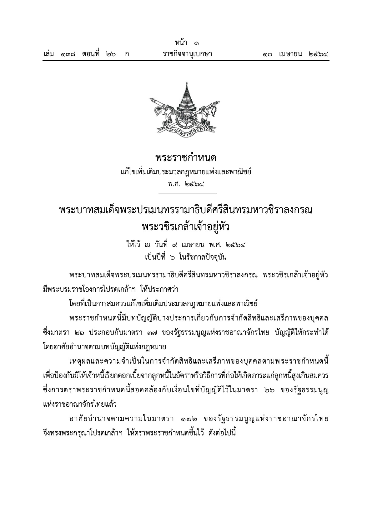ราชกิจจาฯ เผยแพร่ พระราชกำหนด แก้ไขเพิ่มเติมประมวลกฎหมายแพ่งและพาณิชย์ พ.ศ. 2564