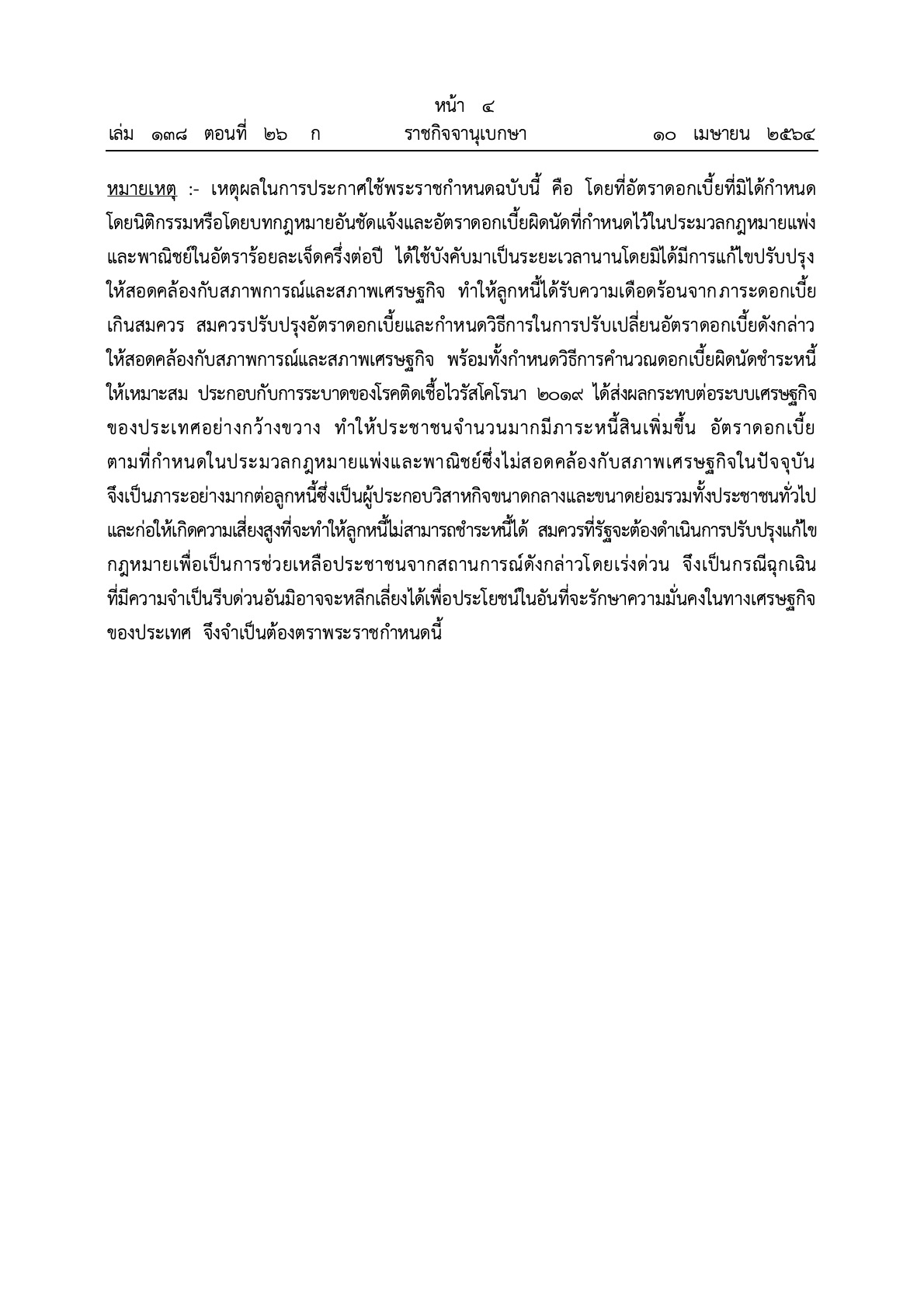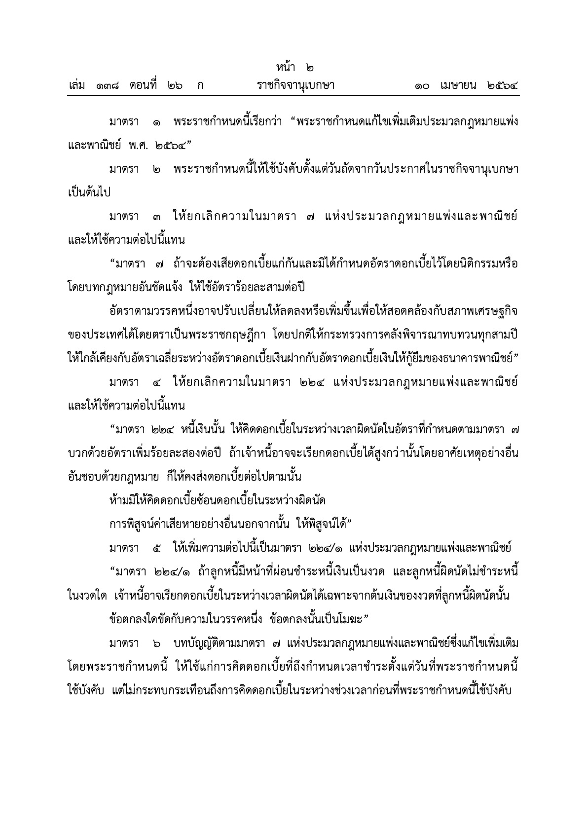 ราชกิจจานุเบกษา 10 เมษายน 2564 ได้เผยแพร่พระราชกำหนด แก้ไขเพิ่มเติมประมวลกฎหมายแพ่งและพาณิชย์ พ.ศ. 2564 โดยเหตุผลในการประกาศใช้พระราชกำหนดฉบับน้ี คือ โดยที่อัตราดอกเบี้ยท่ีมิได้กำหนด โดยนิติกรรมหรือโดยบทกฎหมายอันชัดแจ้งและอัตราดอกเบี้ยผิดนัดท่ีกำหนดไวใ้นประมวลกฎหมายแพ่งและพาณิชย์ในอัตราร้อยละเจ็ดครึ่งต่อปี ได้ใช้บังคับมาเป็นระยะเวลานานโดยมิได้มีการแก้ไขปรับปรุง ให้สอดคล้องกับสภาพการณ์และสภาพเศรษฐกิจ ทำให้ลูกหนี้ได้รับความเดือดร้อนจากภาระดอกเบี้ยเกินสมควร สมควรปรับปรุงอัตราดอกเบี้ยและกำหนดวิธีการในการปรับเปลี่ยนอัตราดอกเบี้ยดังกล่าว ให้สอดคล้องกับสภาพการณ์และสภาพเศรษฐกิจ พร้อมทั้งกำหนดวิธีการคำนวณดอกเบี้ยผิดนัดชำระหน้ี ให้เหมาะสม ประกอบกับการระบาดของโรคติดเชื้อไวรัสโคโรนา 2019 ได้ส่งผลกระทบต่อระบบเศรษฐกิจ ของประเทศอย่างกว้างขวาง ทำให้ประชาชนจำนวนมากมีภาระหน้ีสินเพิ่มขึ้น อัตราดอกเบี้ย ตามที่กาหนดในประมวลกฎหมายแพ่งและพาณิชย์ซึ่งไม่สอดคล้องกับสภาพเศรษฐกิจในปัจจุบัน จึงเป็นภาระอย่างมากต่อลูกหน้ีซี่งเป็นผู้ประกอบวิสาหกิจขนาดกลางและขนาดย่อมรวมทั้งประชาชนทั่วไป และก่อให้เกิดความเสี่ยงสูงท่ีจะทาให้ลูกหนี้ไม่สามารถชำระหนี้ได้สมควรท่ีรัฐจะต้องดำเนินการปรับปรงุแก้ไข กฎหมายเพื่อเป็นการช่วยเหลือประชาชนจากสถานการณ์ดังกล่าวโดยเร่งด่วน จึงเป็นกรณีฉุกเฉิน ที่มีความจำเป็นรีบด่วนอันมิอาจจะหลีกเลี่ยงได้เพื่อประโยชน์ในอันที่จะรักษาความมั่นคงในทางเศรษฐกิจ ของประเทศ จึงจำเป็นต้องตราพระราชกำหนดนี้