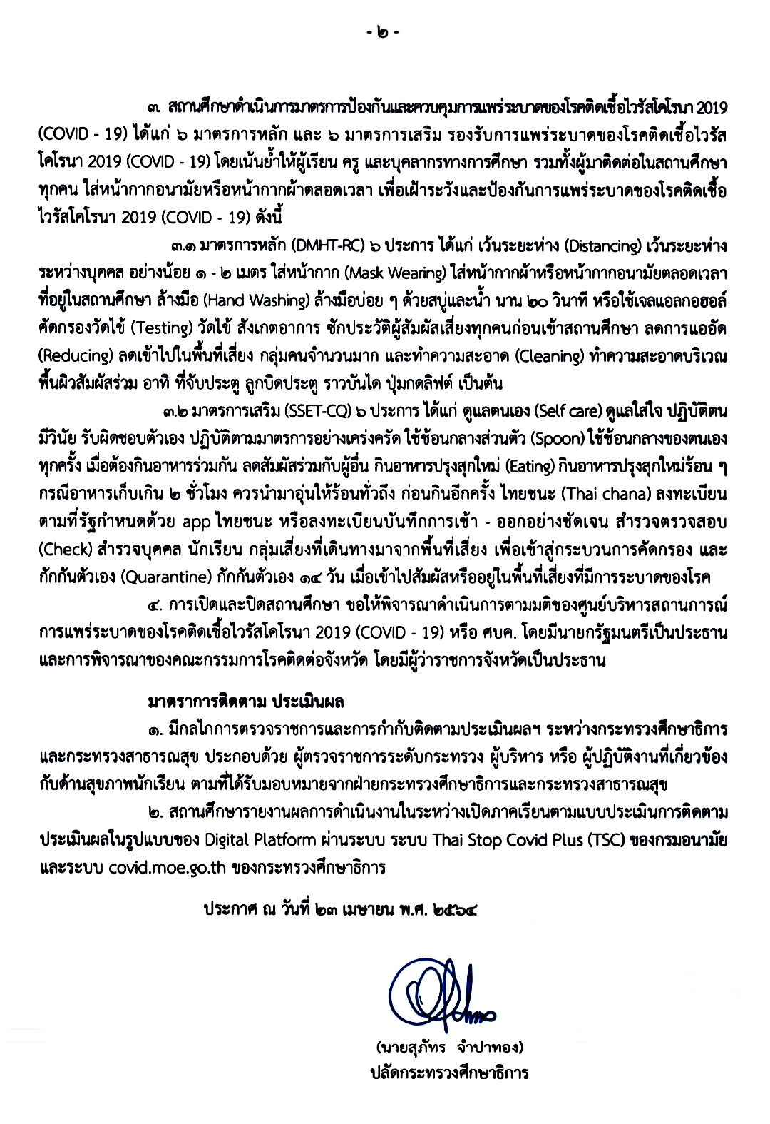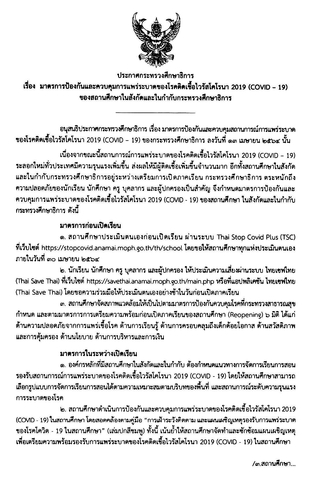 - เห็นชอบมาตรการป้องกันและควบคุมการแพร่ระบาดของโรคติดเชื้อไวรัสโคโรนา 2019 (COVID–19) ของสถานศึกษาในสังกัดและในกำกับกระทรวงศึกษาธิการ