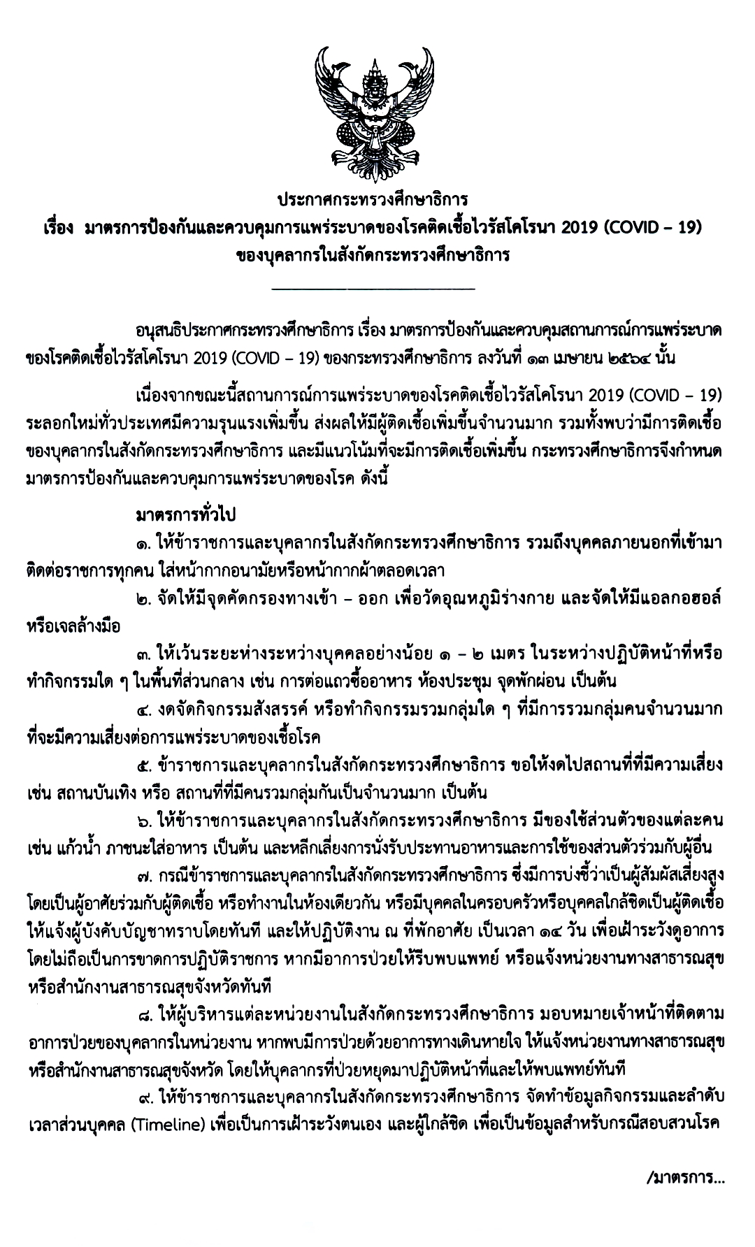 - เห็นชอบมาตรการป้องกันและควบคุมการแพร่ระบาดของโรคติดเชื้อไวรัสโคโรนา 2019 (COVID–19) ของบุคลากรในสังกัดกระทรวงศึกษาธิการ