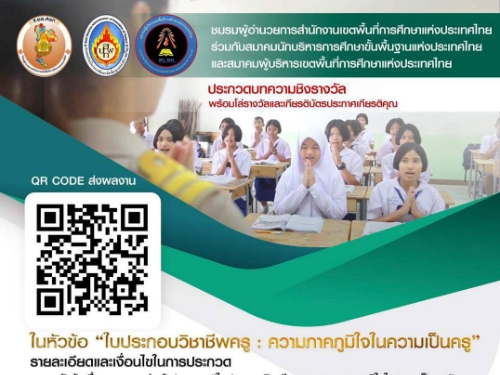 ชมรมผู้อำนวยการสำนักงานเขตพื้นที่การศึกษาแห่งประเทศไทย ร่วมกับสมาคมนักบริหารการศึกษาขั้นพื้นฐานแห่งประเทศไทยและสมาคมผู้บริหารเขตพื้นที่การศึกษาแห่งประเทศไทย ขอเชิญชวนครูสังกัด สพฐ. ส่งประกวดบทความชิงรางวัลพร้อมโล่รางวัลและเกียรติบัตรประกาศเกียรติคุณ