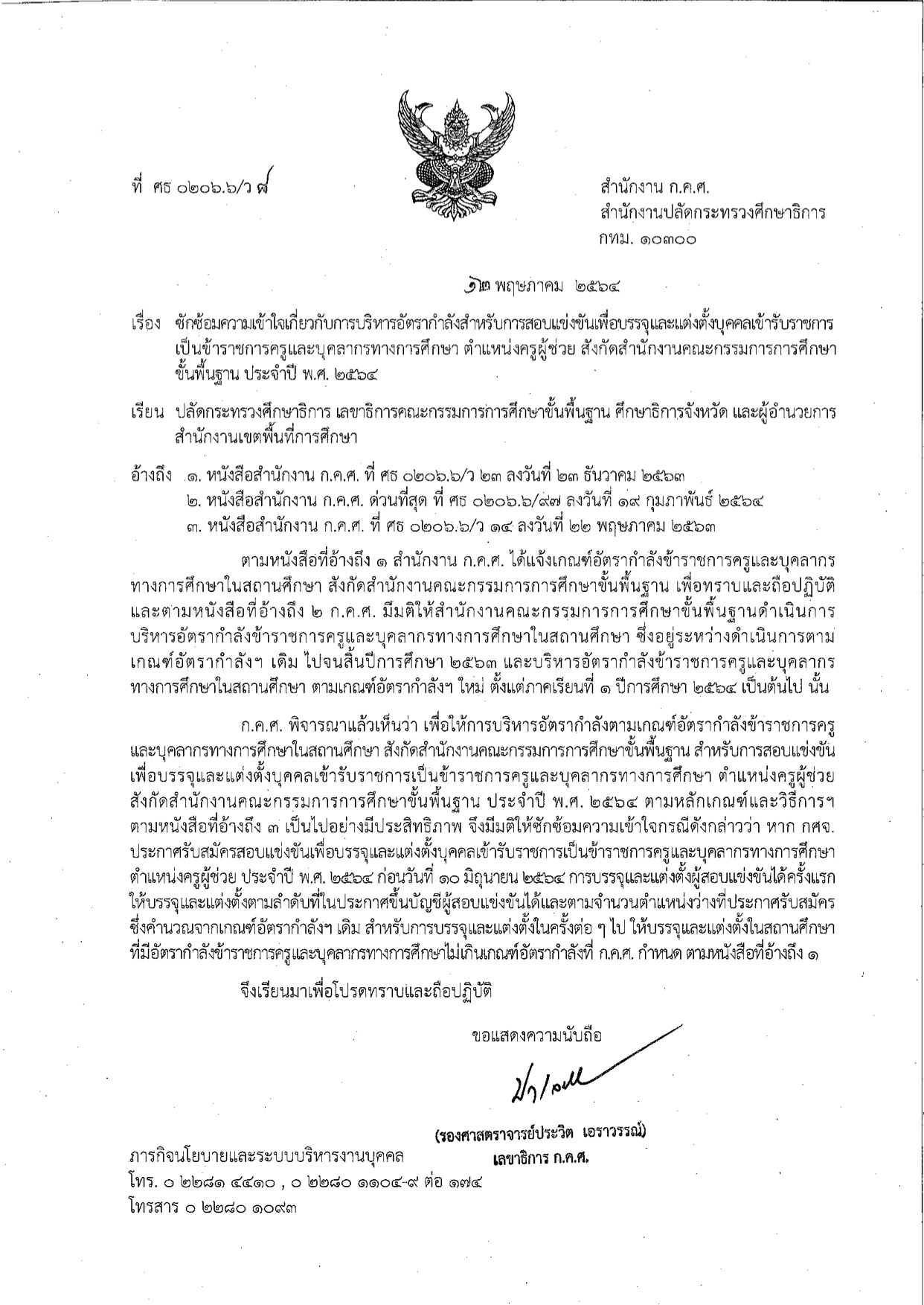 ว8/2564 ซักซ้อมความเข้าใจเกี่ยวกับการบริหารอัตรากำลังสำหรับการสอบแข่งขันเพื่อบรรจุและแต่งตั้งบุคคลเข้ารับราชการเป้นข้าราชการครูและบุคลากรทางการศึกษา ตำแหน่งครูผู้ช่วย สังกัด สพฐ. ประจำปี 2564