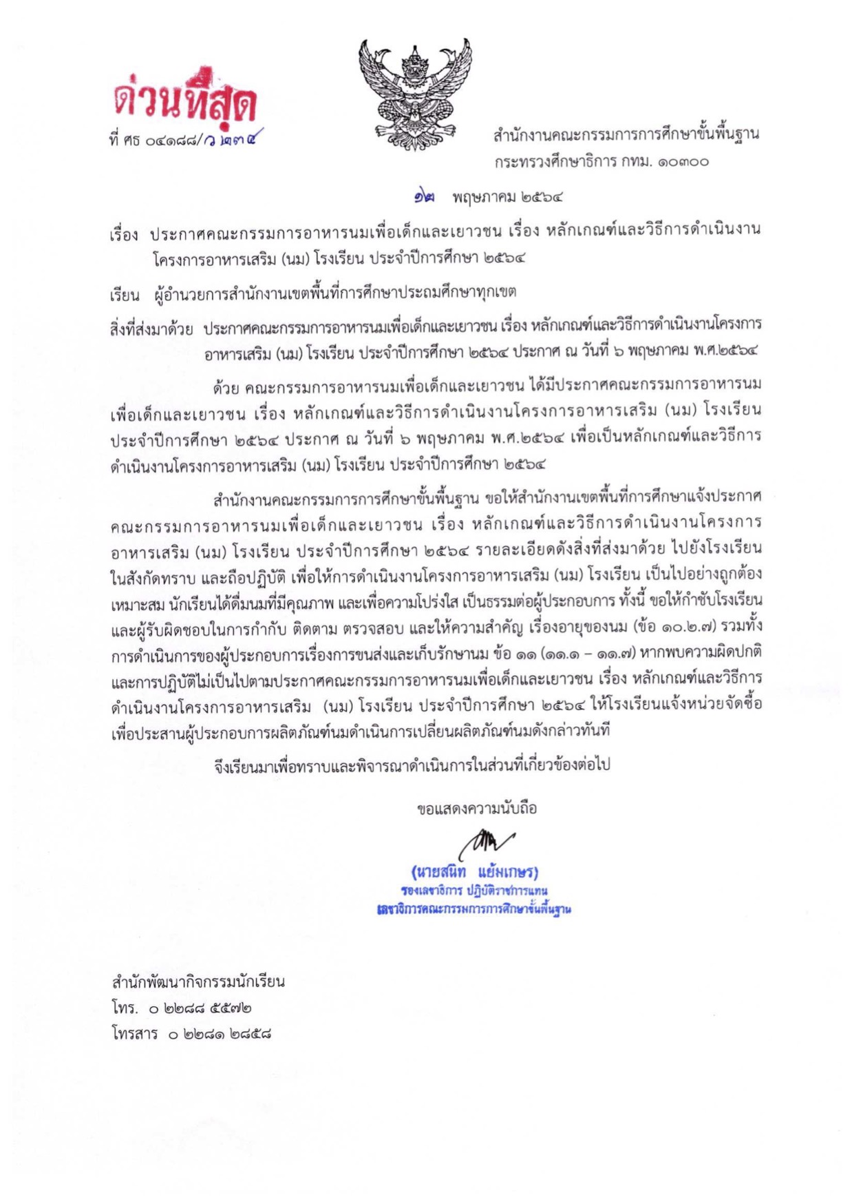 ประกาศคณะกรรมการอาหารนมเพื่อเด็กและเยาวชน เรื่อง หลักเกณฑ์และวิธีการดำเนินงานโครงการอาหารเสริม (นม) โรงเรียน ประจำปีการศึกษา 2564