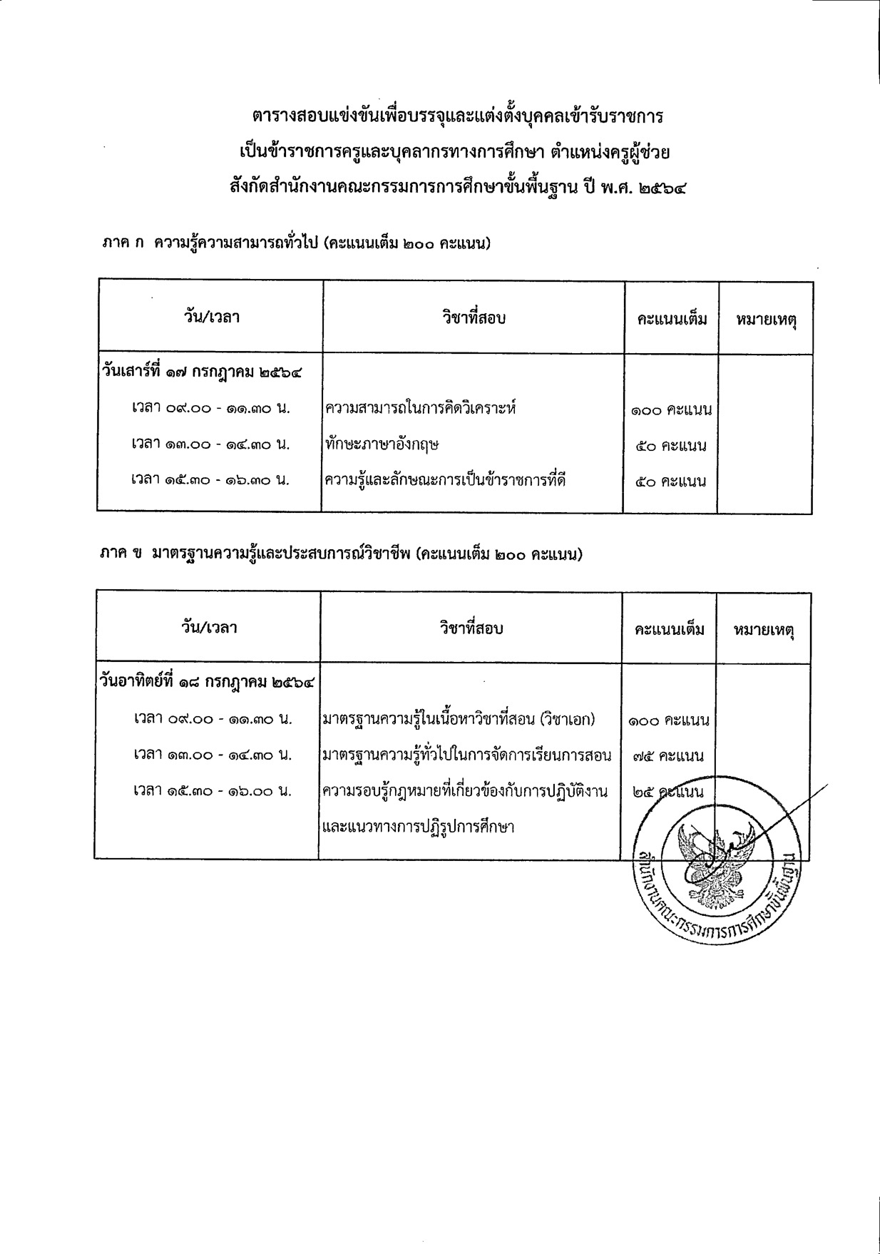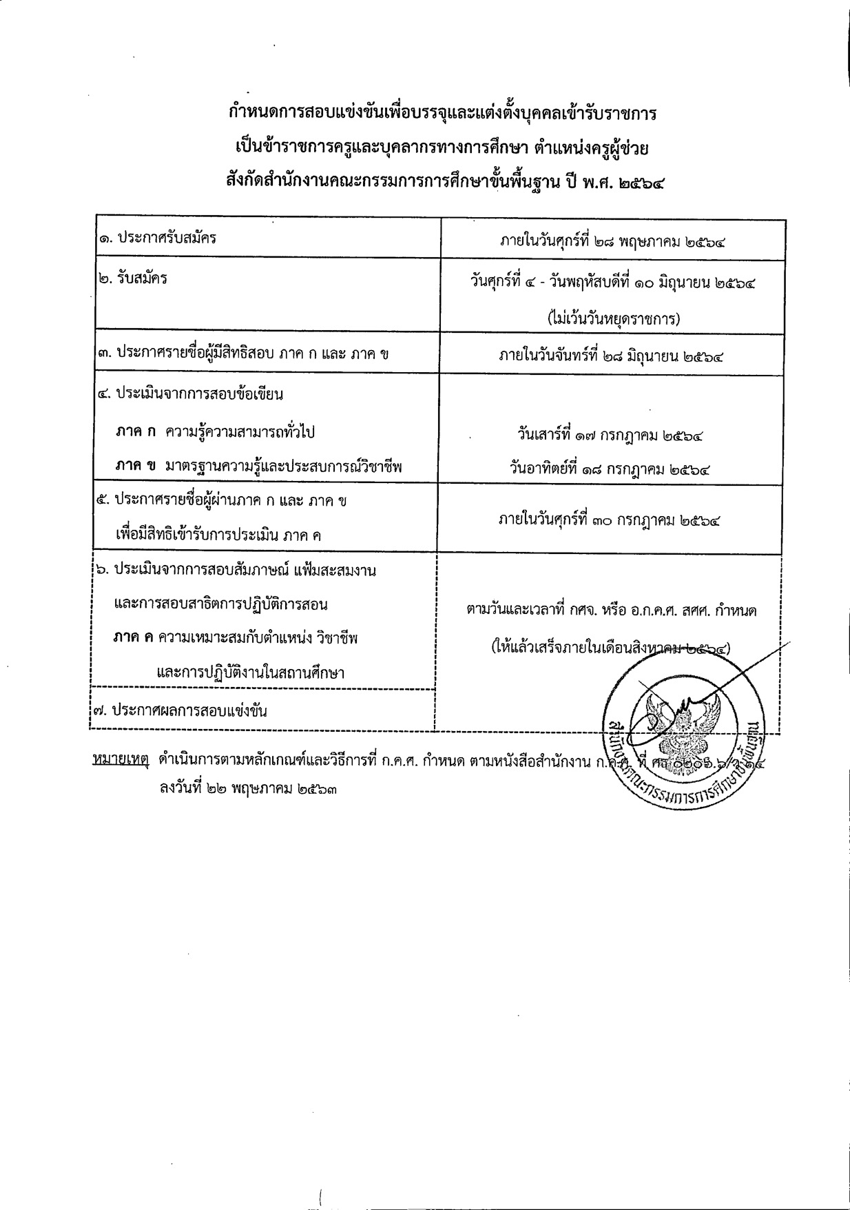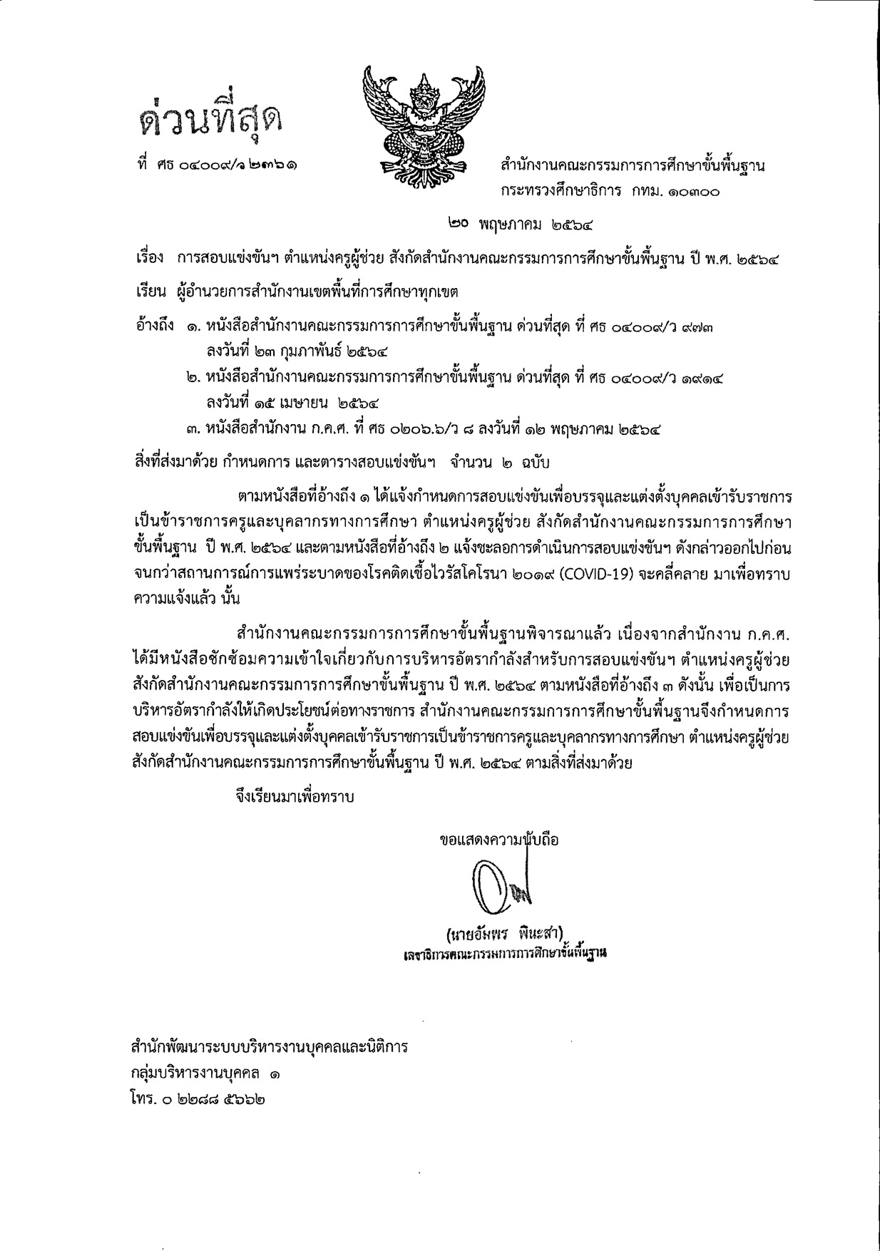 20 พฤษภาคม 2564 สำนักงานคณะกรรมการการศึกษาขั้นพื้นฐาน ได้มีหนังสือ ที่ศธ 04009/ว2361 เรื่อง กำหนดการสอบแข่งขันฯ ตำแหน่งครูผู้ช่วย สังกัด สพฐ. ปี พ.ศ.2564