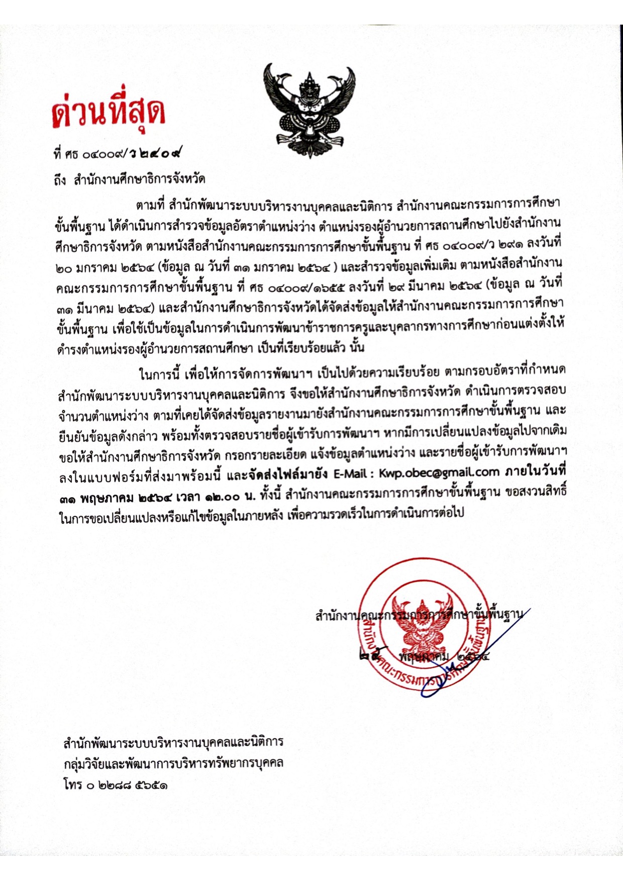 ด่วนที่สุด เรื่องการตรวจสอบตำแหน่งว่างและรายชื่อเพื่อจัดเตรียมการพัฒนาข้าราชการครูและบุคลากรทางการศึกษา ก่อนแต่งตั้งให้ดำรงตำแหน่งรองผู้อำนวยการสถานศึกษา